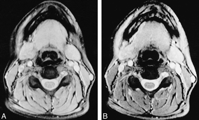 Axial gradient-echo (TR/TE/excitations = 640/10/2) images of cervical cord at C5 without (A) and with (B) the saturation pulse.