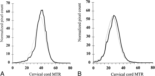 MTR histograms of cervical cord from controls (black line) and entire MS cohort (gray line). Graph A shows MTR histograms from axial, 5-mm-thick slices, graph B shows MTR histograms from sagittal, 3-mm-thick slices.