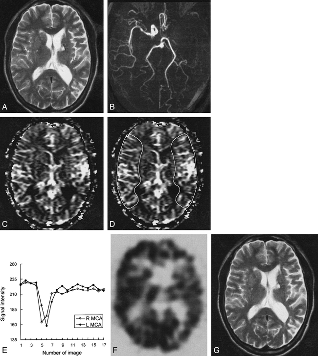 E, Time–signal intensity curves measured during passage of contrast material show no signal change in right MCA distribution compared with normal signal reduction in left MCA distribution.