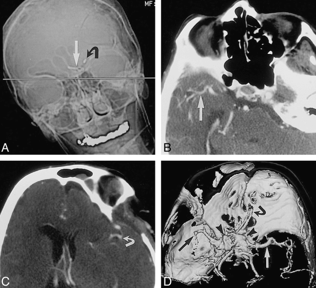 D, Shaded-surface-display image from CT angiogram viewed from above shows left (white arrow) and right (black arrow) middle cerebral artery without interference from aneurysm clip's beam-hardening artifact (arrowheads). Owing to limited z-axis coverage, left middle cerebral artery is abbreviated because examination was targeted to suspicious right middle cerebral artery. Current CT scanner software would allow coverage of entire head, tilted or not.