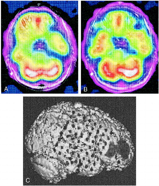 SPECT scans were converted to binary, again using thresholding to best approximate the cortical brain surface, followed by an “autoconnect” step. The SPECT brain volume was then measured. The steps were repeated, changing threshold values as needed, until the binary SPECT volume matched the MR volume to within 3%.
