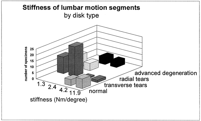 RESULTS: Stiffness averaged 7.0 Nm/degree for the normal group; 1.9 Nm/degree for the disks with concentric or transverse tears; 1.7 Nm/degree for disks with radial tears; and 3.1 Nm/degree for disks with advanced degeneration. The differences were statistically significant.