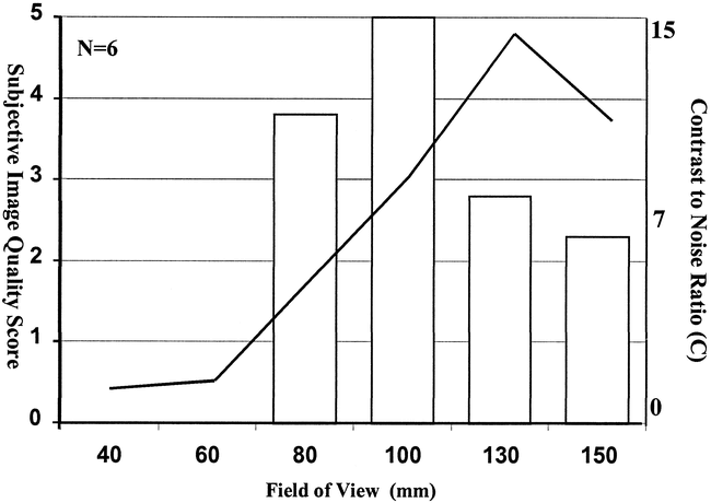 Histogram of the subjective primary image quality scores (left axis) at varying fields of view. The line plot represented on the right axis shows the mean value for calculated image contrast from six normal data sets