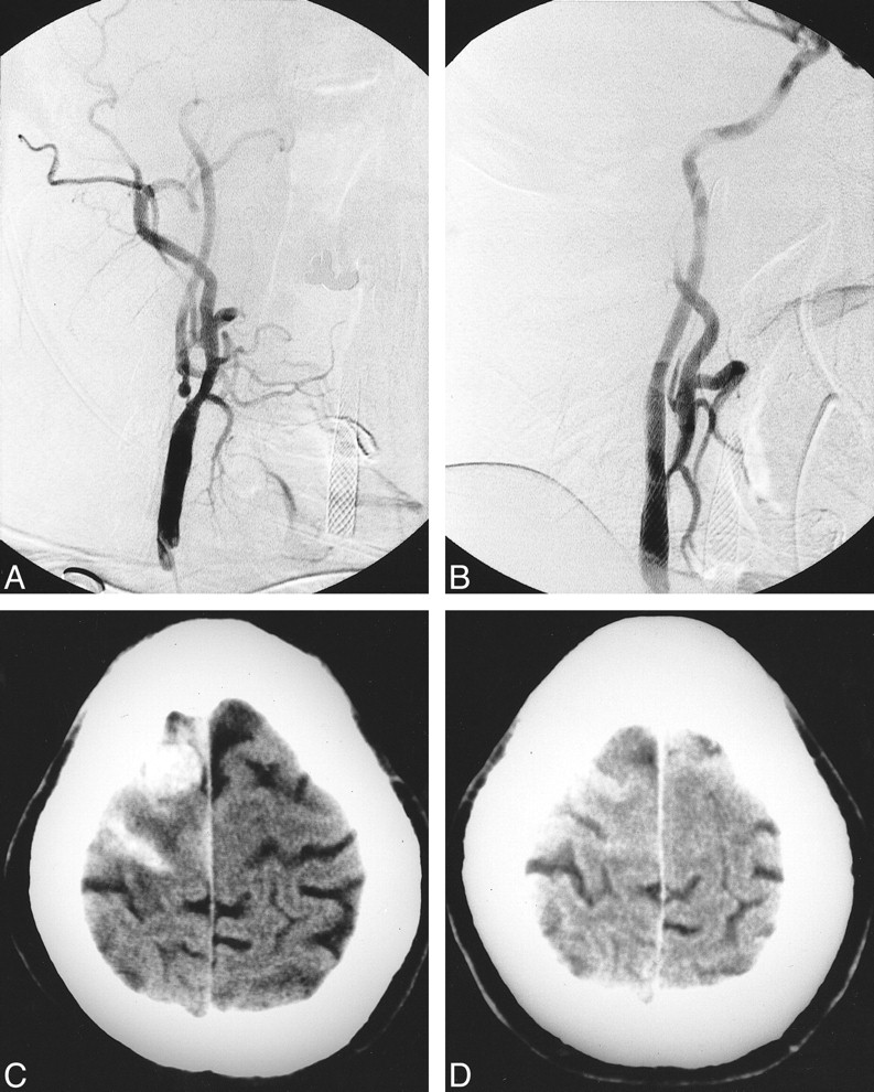 C and D, Angiogram immediately post stenting demonstrates extravasation from a lenticulostriate artery (arrow). At no time during the procedure did a catheter or guidewire enter into the intracranial circulation.