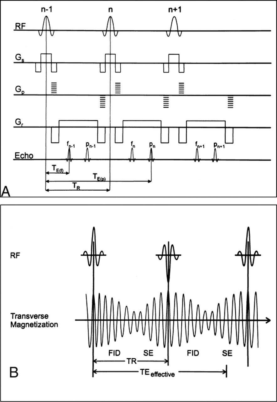 B, Alternating RF pulses and oscillating transverse magnetization in relation to the free induction decay (FID) and spin echo (SE) in SSFP imaging with the PSIF sequence.