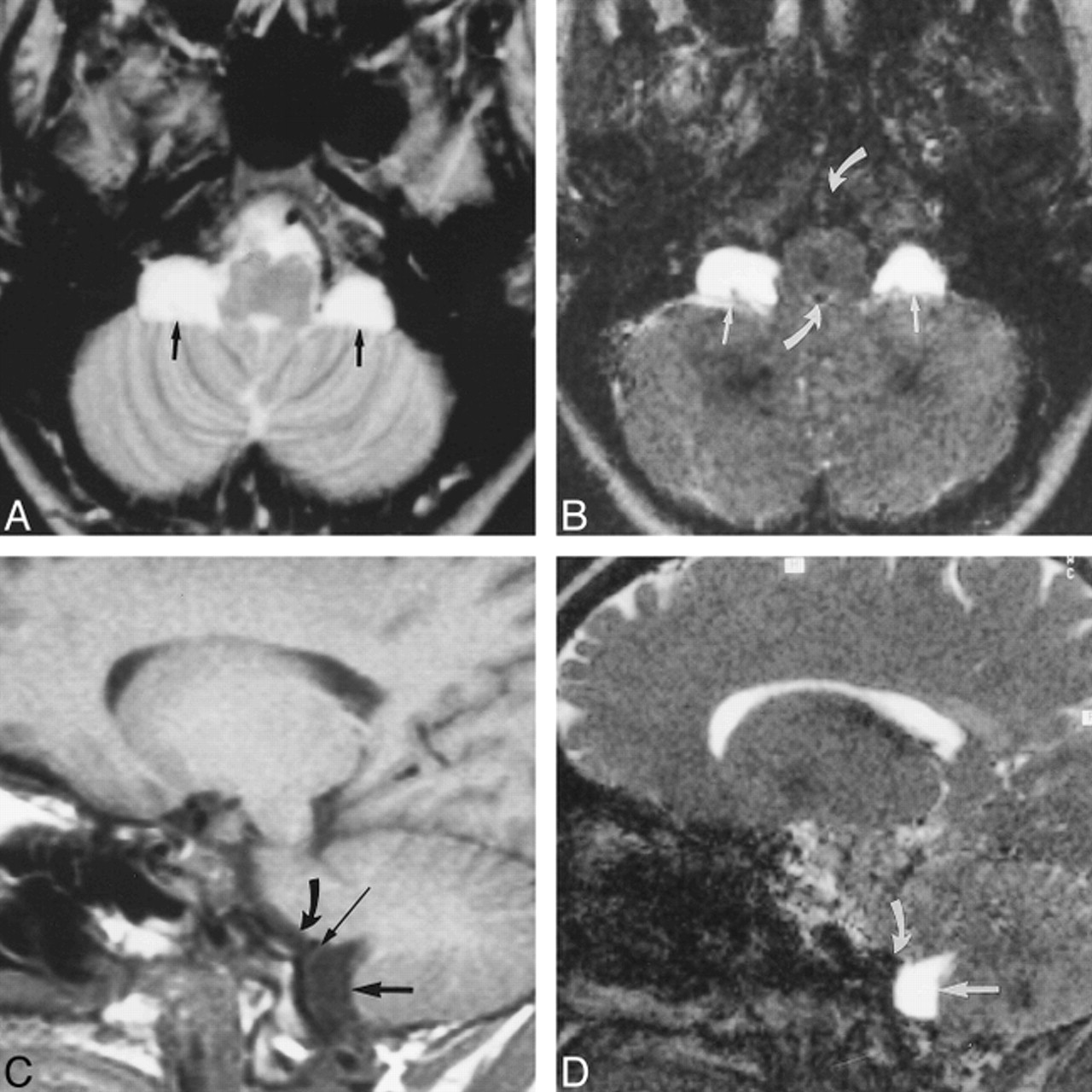 C, Sagittal T1-weighted SE image (500/12/2) with suspected thin membrane (long arrow) between the isointense subpeduncular space (curved arrow) and the left cerebellopontine mass (short straight arrow).