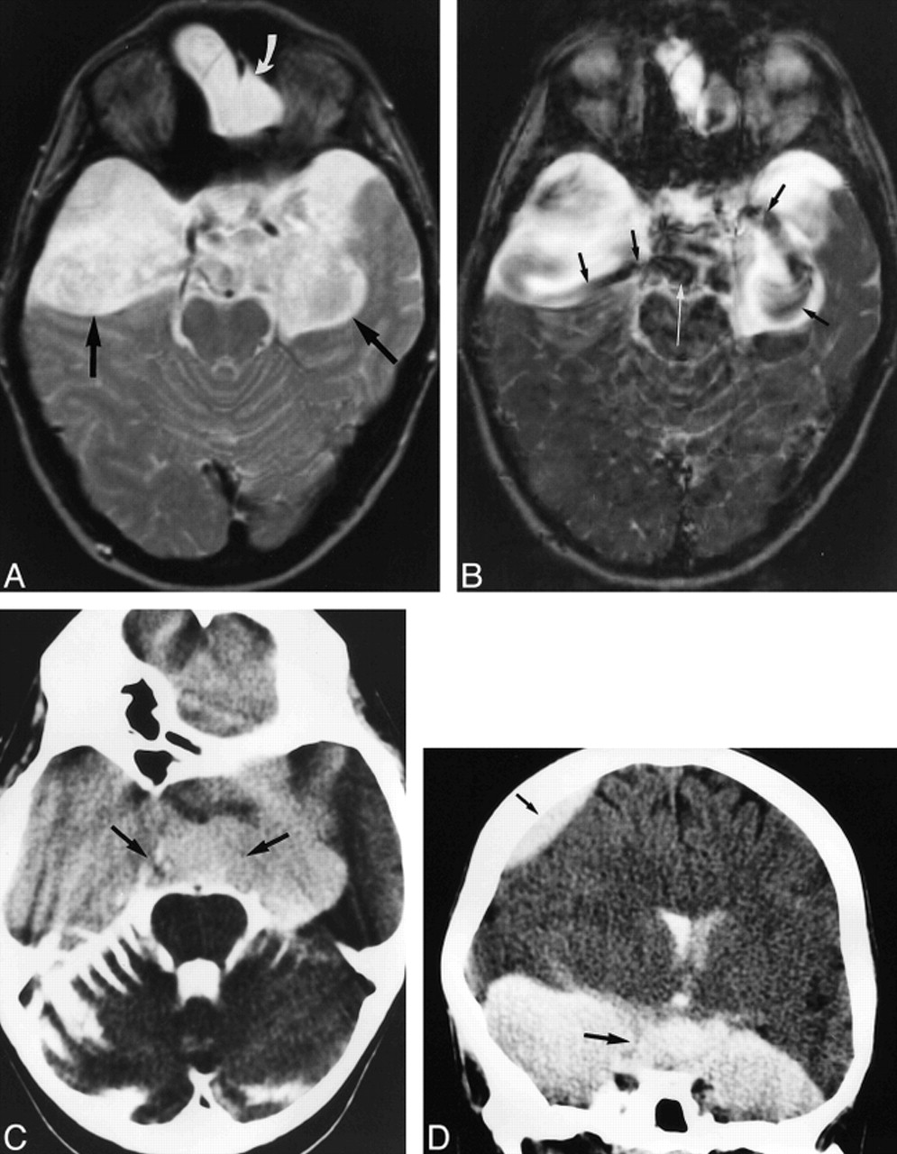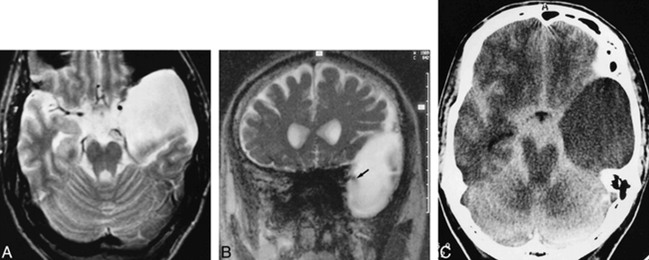 C, CT cisternogram shows contrast enhancement with layering in the parasellar and paracerebellar cysts (arrows), providing further evidence of communication. Layering was caused by the patient's prolonged supine position.
