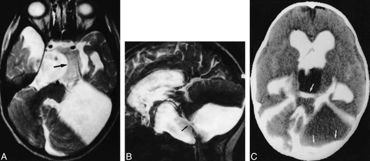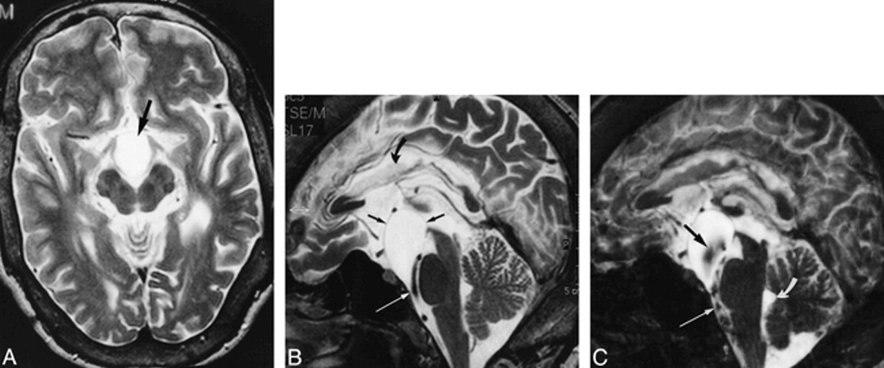B, Midsagittal T2-weighted section (2000/80/1) shows defined margins of the cyst (straight black arrows), except for the narrowing between the basilar artery and skull base (white arrow). Note callosal dysplasia (curved arrow). The bottom of the third ventricle is elevated.