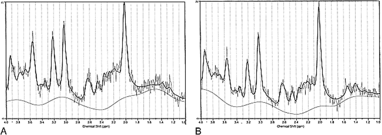 Given the possibility of a localized increase in paramagnetic species, one may question whether the differences in spectral results between ALS patients and control subjects (Table 1) are due to T2 shortening effects rather than to changes in the concentrations of metabolites. T2 effects are probably not responsible for the differences, since short TE spectra were obtained in this study and since Block et al (11) have shown that the T2 relaxation times for several metabolites (specifically Cho, Cr, and NA) in the precentral region of patients with ALS are unchanged from those of control subjects.