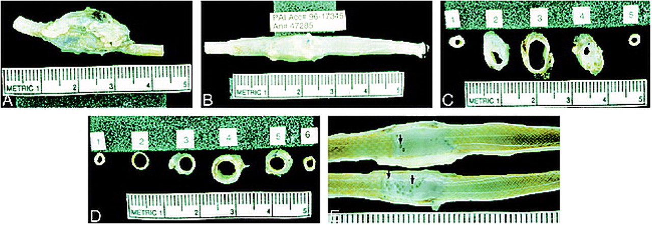 E, Longitudinal section. All stents were embedded in a glistening, translucent neointima. The stented aneurysms appear solid except for small channels, which connect the lumens of the carotid arteries with those of the aneurysms (arrows).
