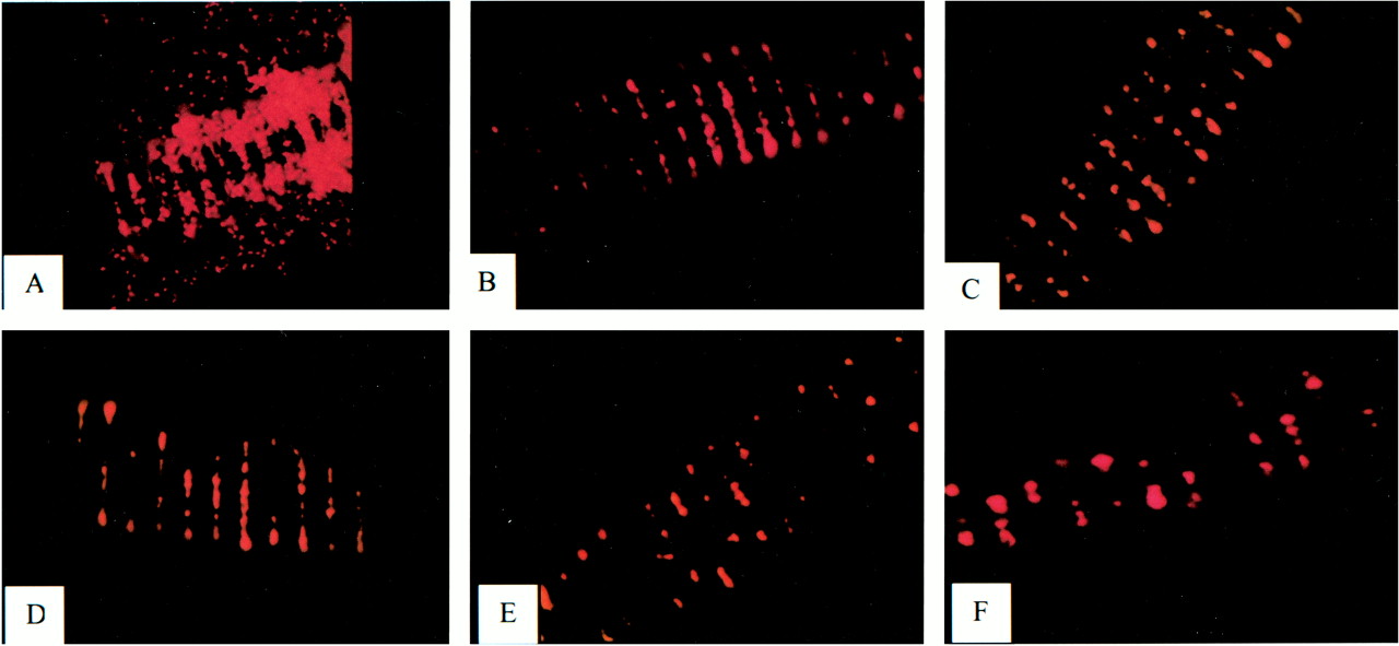Part 2. A) Fluorescence-labeled cells were grown in culture on platinum coils, which were then exposed to systemic arterial flow in the rabbit thoracic aorta for various lengths of time up to 40 minutes. The coil segments were then examined using fluorescent microscopy and the presence and relative amount of cells remaining on the coil were documented.