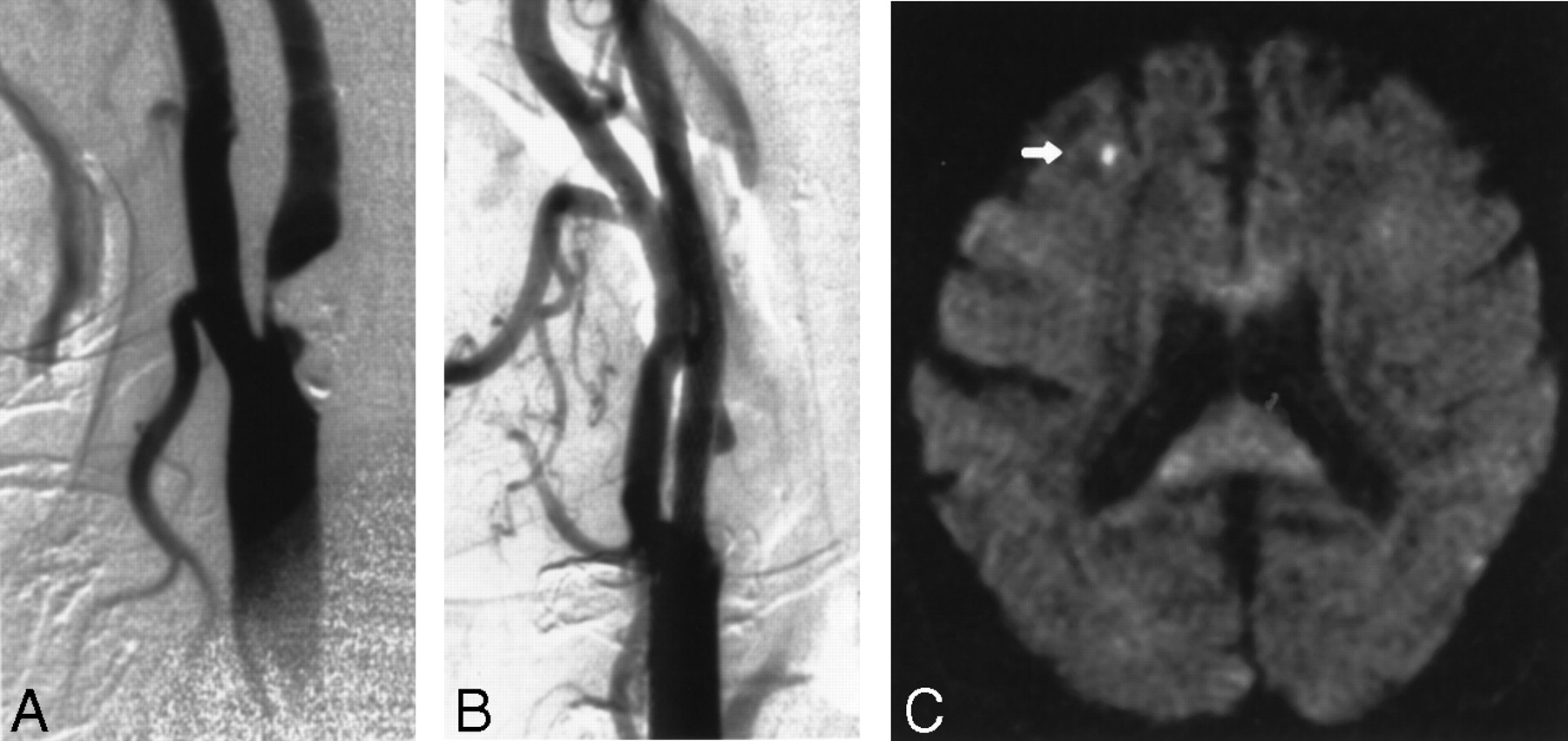 Müller et al (19 detected ipsilateral lesions on diffusion-weighted images obtained in 26 (34%) of 77 patients after carotid endarterectomy. Only five of these 26 patients with positive diffusion-weighted imaging results were symptomatic during or after the procedure. Compared with the other procedures, the procedures that caused positive diffusion-weighted imaging results were associated with a higher total microembolic count, as determined with transcranial Doppler monitoring during the operation. These data demonstrate that, after any manipulation of the carotid artery, new postprocedural lesions can occur in as many as one third of patients, an most of them are asymptomatic.