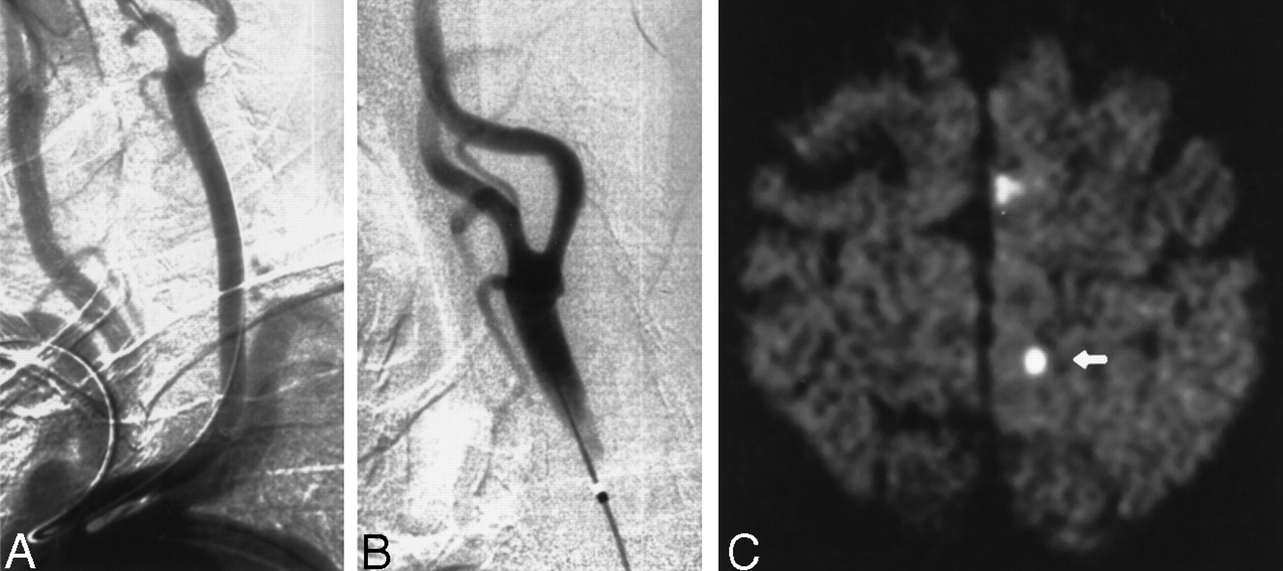 C, Postprocedural axial diffusion-weighted MR image (6000/103/1) shows a new ipsilateral lesion (<5 mm) in the cortical territory of the MCA (arrow).