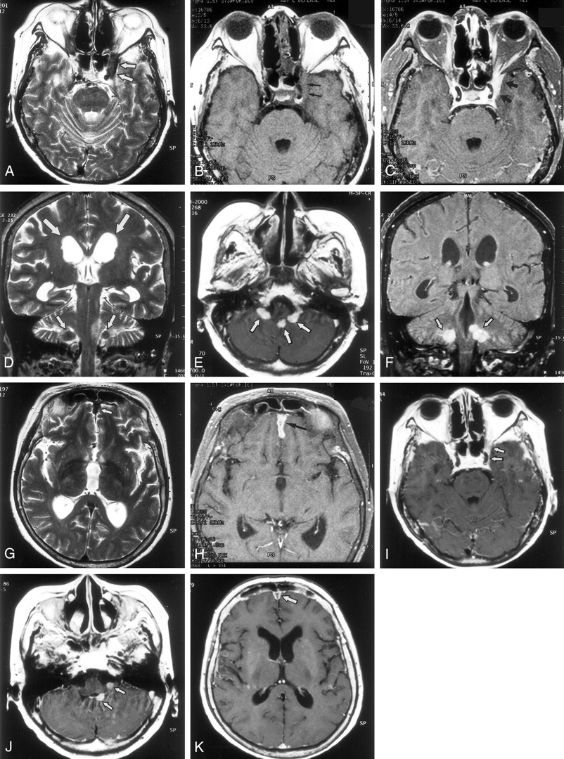 I, Axial contrast-enhanced T1-weighted image (600/15/1), obtained 9 months after treatment with steroids and immunosuppressants, shows reduction of the abnormal enhancing lesions around the left cavernous sinus and superior ophthalmic fissure (arrows).