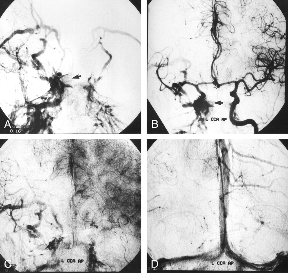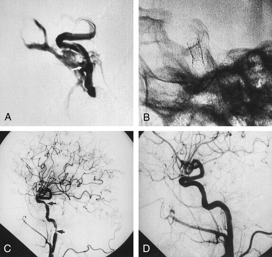 C, Postprocedural right CCA angiogram obtained after deployment of stent-graft reveals cessation of contrast material extravasation and closure of the CCF. Note the focal transient spasm distal to the stent-graft and at the subpetrous portion of cervical ICA (arrows).
