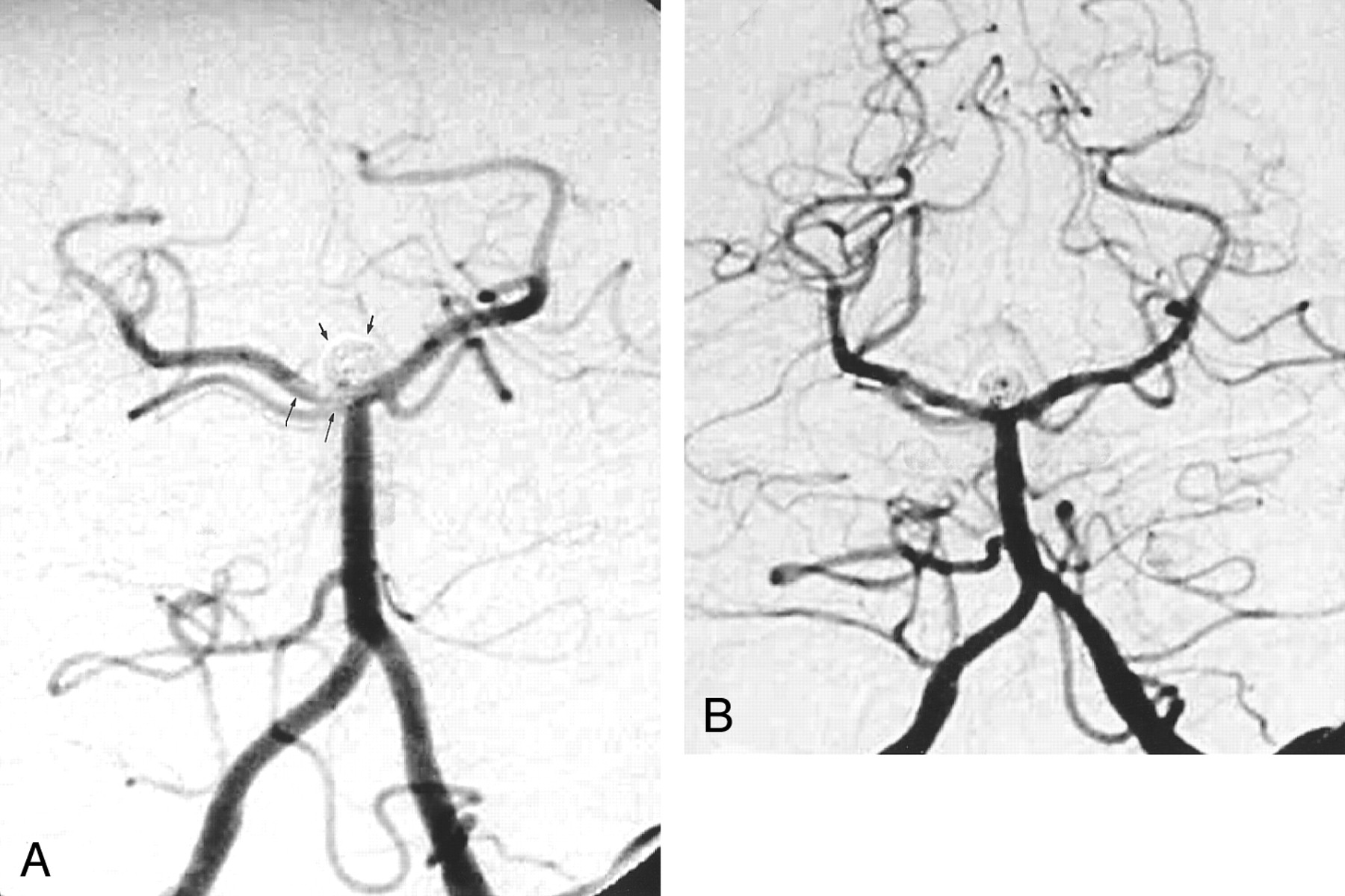 A 49-year-old male patient with subarachnoid hemorrhage was referred for GDC treatment of a basilar tip aneurysm. After placement of a vascular sheath, 5000 U of heparin was IV administered. Diagnostic angiography revealed a 6-mm-diameter basilar tip aneurysm with a 5-mm neck. A catheter was placed in the left vertebral artery with a guide catheter, and a microcatheter was used to access the aneurysmal sac. ACT measured 200 seconds, and a 2000-U bolus of heparin was administered. A T-10 6 mm × 8 cm 3D coil was placed and detached successfully in the aneurysmal sac. During placement of the second coil (T-10 2D, 4 mm × 6 cm), 1 to 2 mm of the leading edge of the initially placed 3D coil was displaced into the basilar tip. Control angiography showed no thrombus or distal emboli. The aneurysm was subsequently tightly packed with GDCs. After completion of coil placement, control angiography showed that nonocclusive thrombus had formed on the coil and extended into the right and left P1 segments of the posterior cerebral artery (Fig 2). Additional heparin was administered to increase the ACT to 300 seconds. Repeat angiography showed a decrease in the thrombus burden without distal emboli. The remainder of the aneurysmal lumen was packed with GDCs. At the termination of the case, there was a small, nonocclusive thrombus remaining in the right P1 segment and along the left, inferior coil-parent vessel interface. Heparin infusion was maintained to keep the activated partial thromboplastin time at 50 to 70 seconds. A regimen of aspirin (325 mg) was started after the procedure. Repeat angiography performed on post-treatment day 1 showed resolution of the thrombus without distal emboli (Fig 2). However, there was partial recanalization of the aneurysm centrally. Follow-up angiograms obtained at 6 months showed no opacification of the central portion of the aneurysm (Fig 2B) but no change in the residual contrast opacification at the right base of the aneurysm, consistent with a small remnant. On post-treatment day 2, the patient had a generalized seizure. CT of the head showed hydrocephalus, which was treated with lumbar puncture and drainage. A right sixth nerve palsy was detected on post-treatment day 3, which resolved within 24 hours. The neurologic examination performed at the time of discharge showed no deficit.