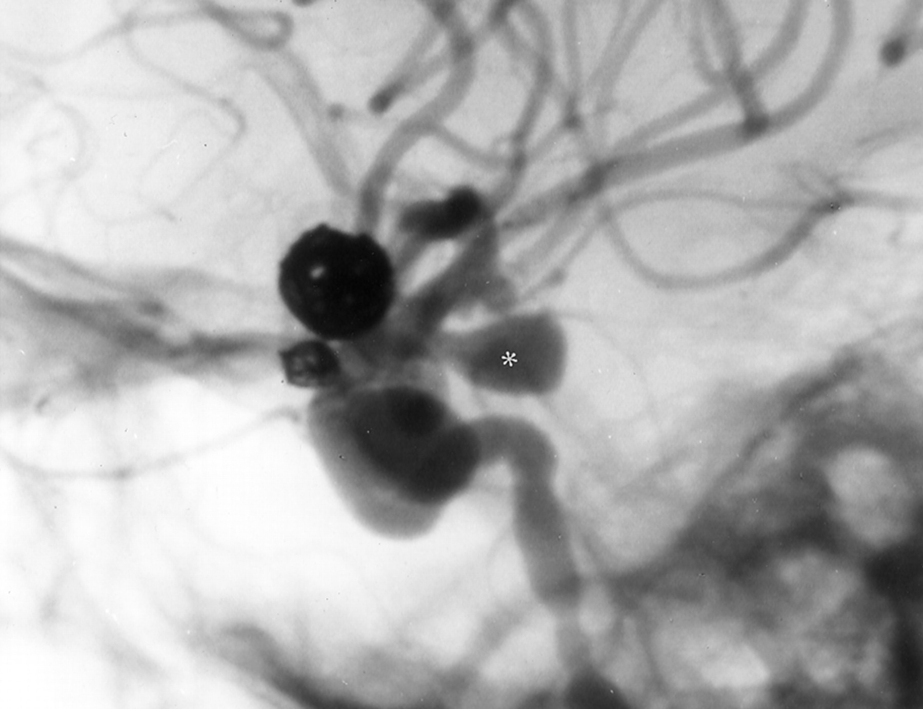B, Lateral view angiogram of the left internal carotid artery. Astserisk indicates posterior communicating artery aneurysm.
