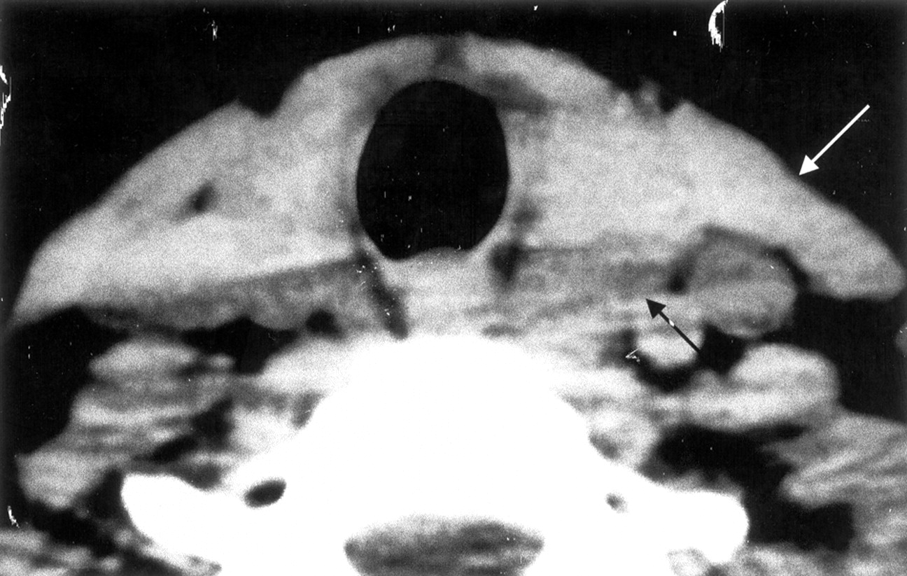Patient 1. Contrast-enhanced axial CT scan shows slight enlargement of the left thyroid lobe. Decreased attenuation can be seen in the posterior portion of the left thyroid lobe (curved arrow), and slightly decreased attenuation can be seen anteriorly in the right thyroid lobe (straight arrow).