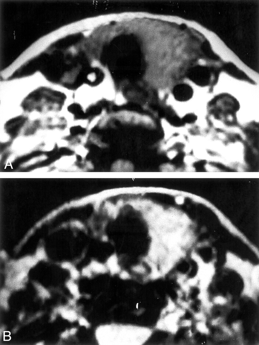 On MR images, the normal thyroid gland shows homogeneous T1-weighted signal intensity that is slightly greater than that of skeletal muscle. On T2-weighted sequences, the normal thyroid gland is hyperintense to the neck muscles; after the administration of contrast material, the normal gland enhances diffusely and homogeneously. Otsuka et al (7) reported the cases of three patients with subacute thyroiditis. They found the thyroid glands to have slightly irregular margins and a higher than normal T1-weighted signal intensity. They also noted a much higher than normal T2-weighted signal intensity. Our patient 1, who underwent MR imaging, showed mild increased signal intensity of the thyroid gland on the T1-weighted images and more pronounced increase in the signal intensity on the T2-weighted images, consistent with the diffuse inflammatory nature of subacute granulomatous thyroiditis (Fig 5).
