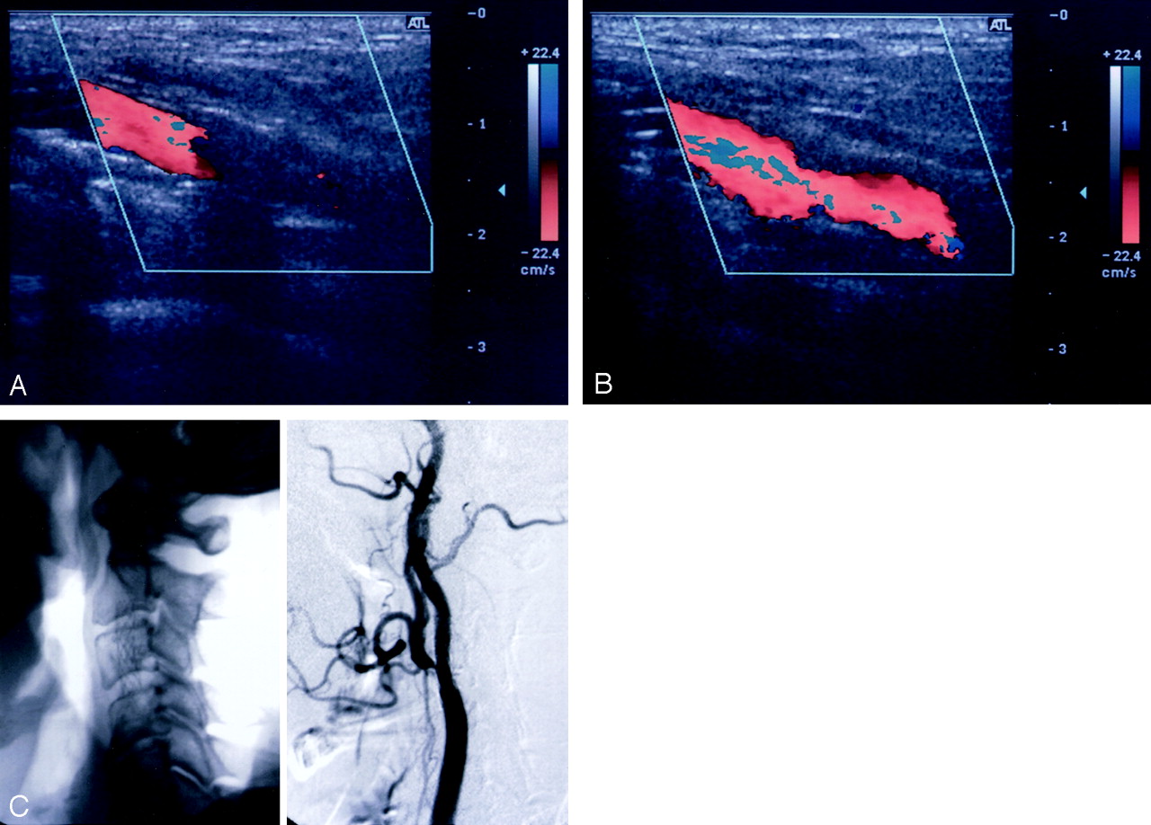 Doppler sonography is a noninvasive and easily repeatable investigation. Carotid Doppler scanning for the evaluation of the carotid circulation, however, has some limitations. A patient with a short neck or a high carotid bifurcation often cannot be fully imaged by means of conventional Doppler imaging (6, 7). In addition, the blood flow in the residual lumen in patients with high-grade carotid stenosis cannot be detected because of sonographic absorption by the atheroma. Furthermore, in patients who undergo CS placement for the treatment of carotid artery stenosis, endovascular prostheses make sonographic penetration difficult (8).