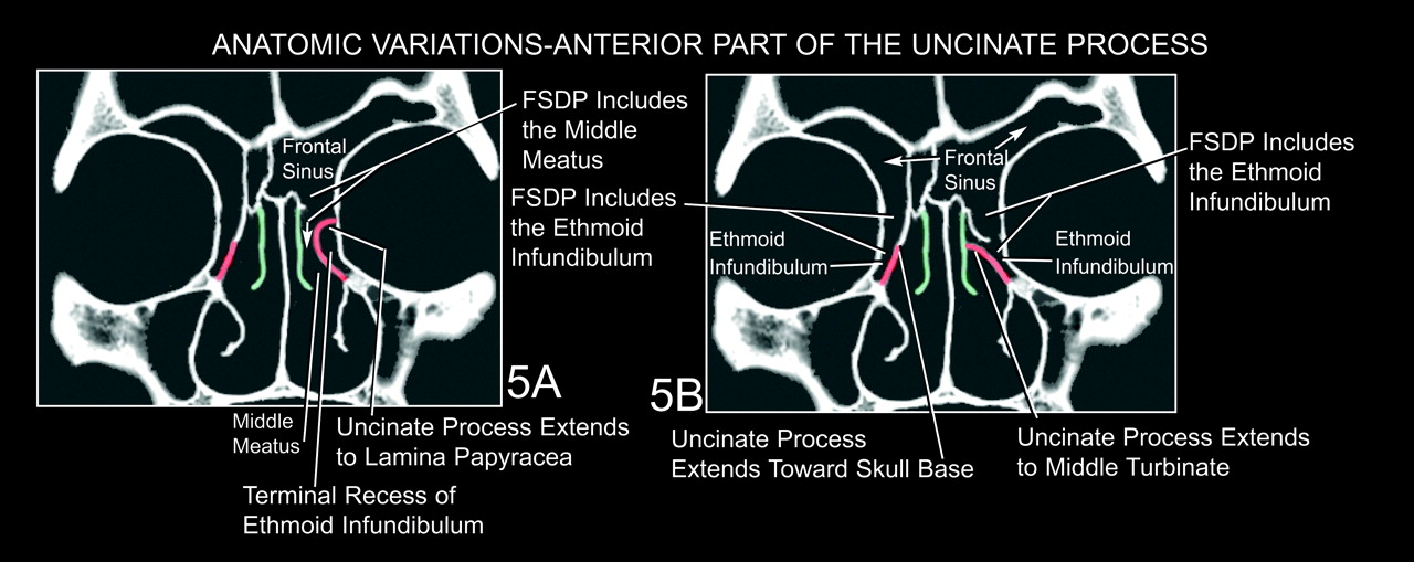 E, The anterior portion of the uncinate process (red) extends upward to the skull base in the right side of this specimen, so the FSDP includes the ethmoid infundibulum. The frontal ostium remains poorly localized.