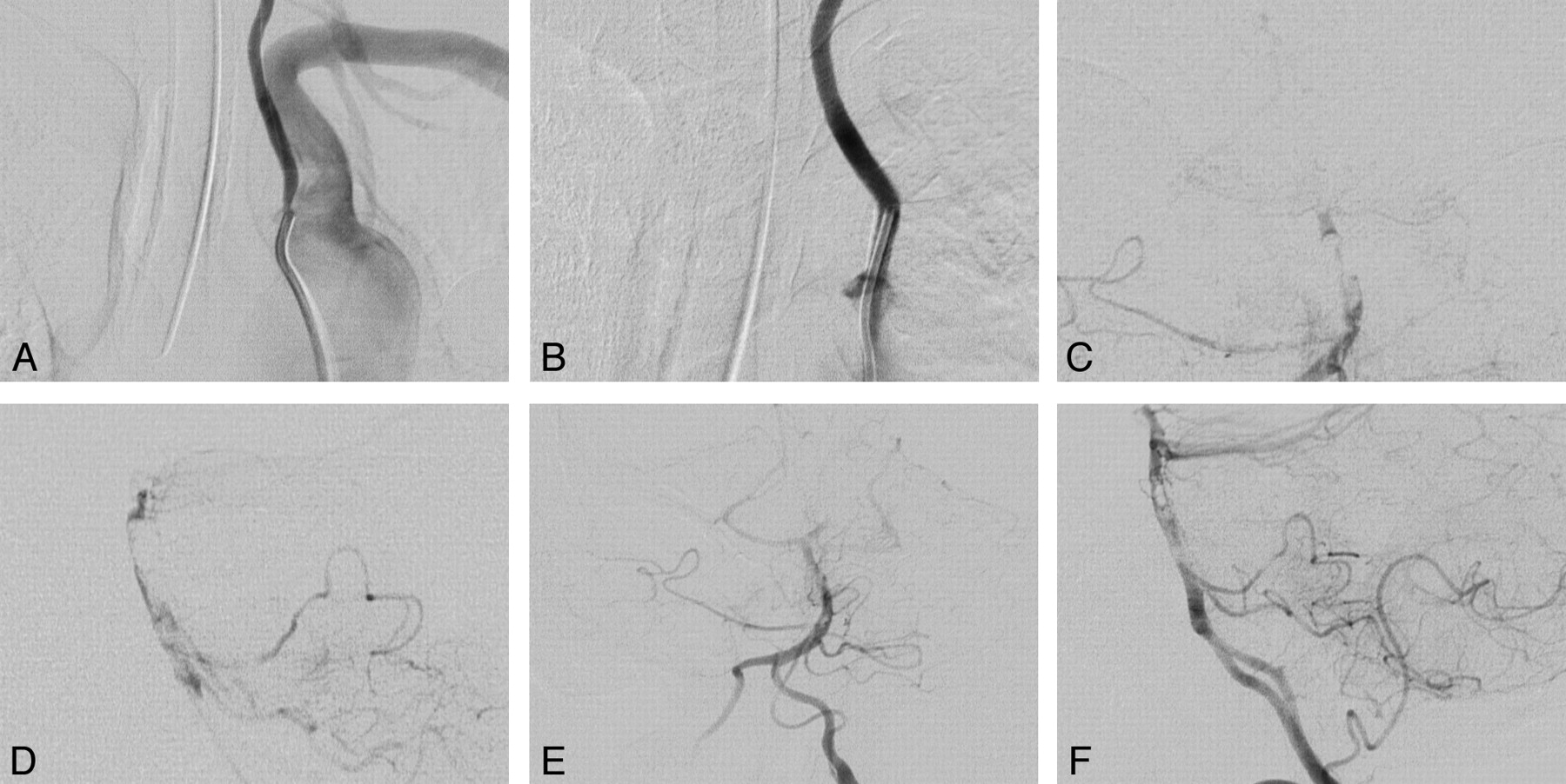 Patient 3 had excellent improvement of neurologic symptoms after extensive neurointervention, including multiple stent placement, angioplasty, and thrombolysis. He was transferred to an acute rehabilitation unit after a month of hospitalization. He continued to have steady improvement of disability, was able to ambulate with moderate assistance in the beginning, and progressed to requiring minimal assistance at the end of 3 weeks of rehabilitation. Six months from his initial stroke, however, he was readmitted after being found collapsed and had evolving massive right middle cerebral artery infarct. He died within a few days in the hospital.