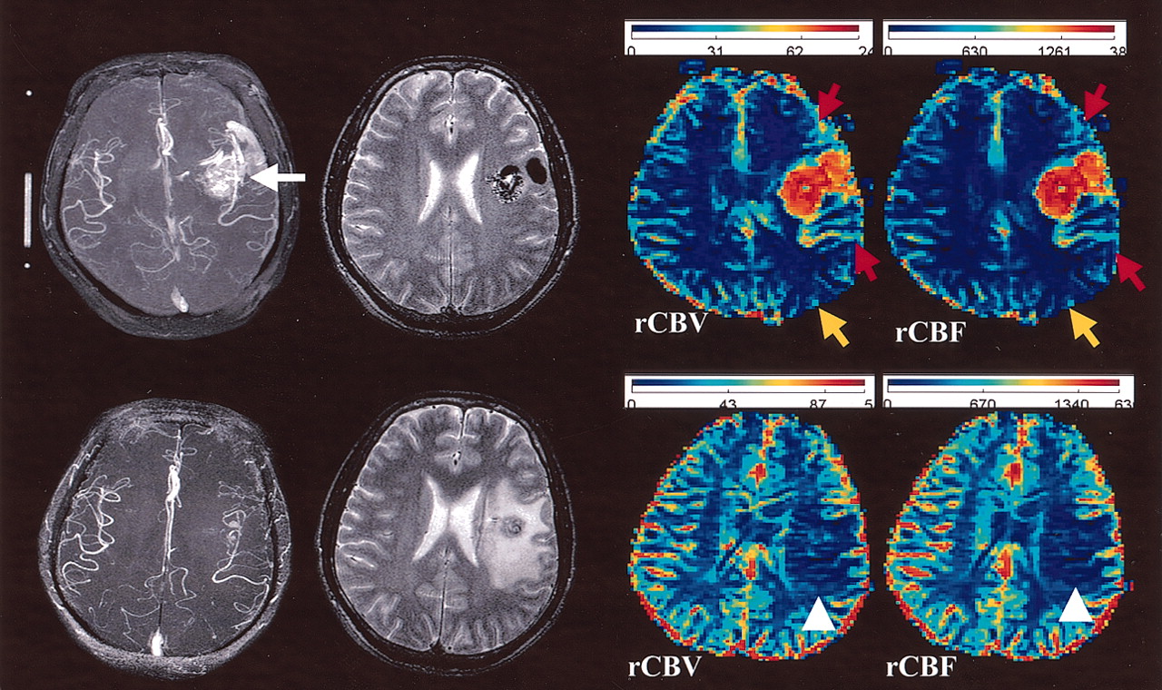 Lower row (24 months after radiosurgery), Collapsed-view 3D time-of-flight MR angiogram shows a small remnant of the AVM. T2-weighted transaxial image shows a moderate degree of radiation-induced edema. Perfusion maps show decreased rCBV and rCBF in the perinidal regions (arrowheads). They correspond to the regions with radiation-induced edema.
