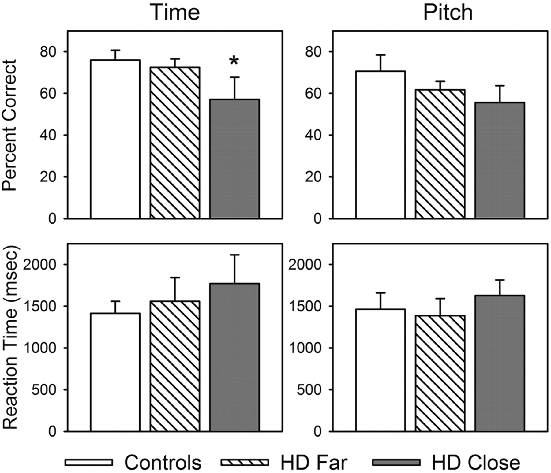 Activation tasks that reliably and selectively activate the striatum in healthy individuals can potentially provide biologic markers for early change in pre-HD. Mounting evidence suggests that the nigrostriatal dopaminergic system underlies our perception and reproduction of temporal information. Pharmacologic manipulation of striatal dopamine neurotransmission disrupts behaviors that involve precise timing in animals (13) and humans (14). In addition, impaired temporal processing has been observed in unmedicated patients with Parkinson’s disease (PD), with improvement associated with the initiation of dopamine replacement (15, 16). Results of an fMRI investigation of time discrimination in healthy individuals suggested that the basal ganglia are selectively activated during the encoding of temporal information (17). To our knowledge, no formal studies of temporal processing have been conducted in individuals with pre-HD. Individuals with manifest HD, however, have impaired timing of a conditioned eyeblink response (18).