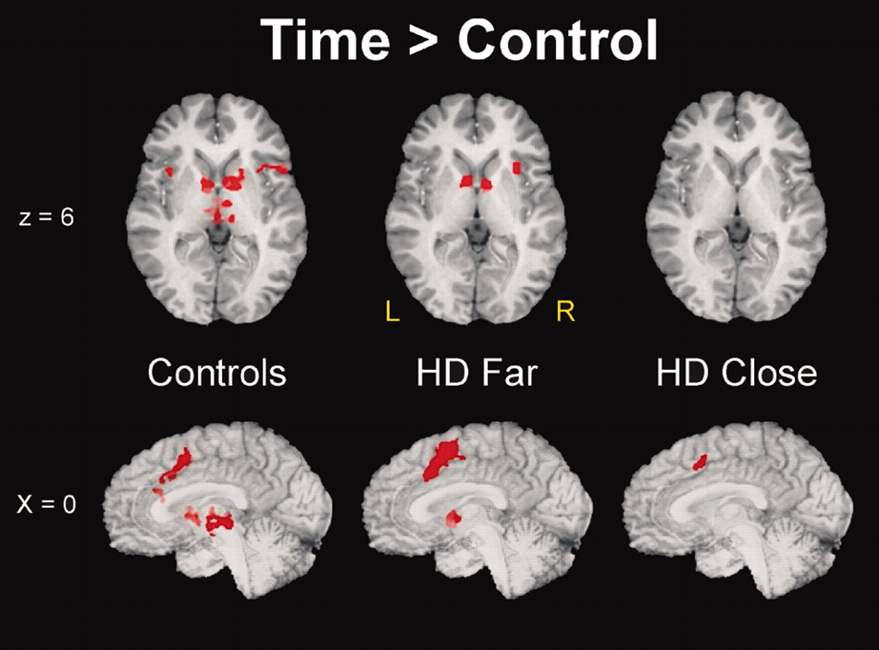 The present findings demonstrate that fMRI is sensitive to changes in striatal function long before the emergence of motor symptoms in pre-HD. This observation has several important implications. First, fMRI can potentially be used to identify early neural degeneration before the onset of clinical symptoms. In close participants, subcortical structures were activated significantly less than they were in control participants, whereas far participants had an intermediate level of activation. Neither close participants nor far participants had cognitive or motor deficits in behavior, as measured with the UHDRS, although there were significant differences in performance between control participants and close participants on the T task. Despite changes in neural activation in both groups, structural changes in the caudate were observed only in close participants. This change in neural activation in the close group may be attributed to cell death, since caudate structural atrophy was observed in this group; however, structural atrophy was not observed in far participants, although there was a change in neural activation.