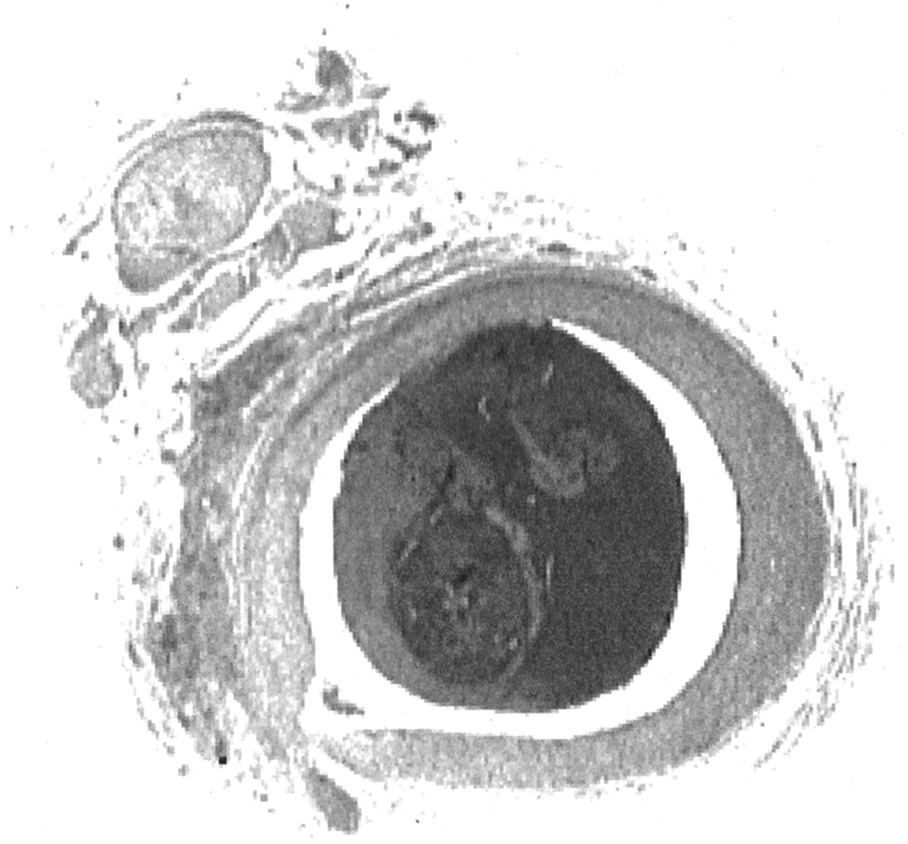 Cross section of ascending pharyngeal artery obtained 3 hr after clot injection seen at ×15 magnification. Hematoxylin and eosin staining reveals an intact endothelium, with no evidence of vessel wall disruption or subintimal hemorrhage. Solid thrombus fills the vessel lumen.