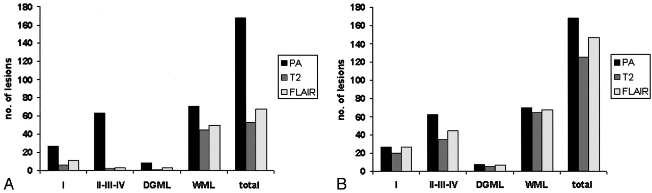 Lesion scores. I, type I cortical lesions; DGML indicates deep GM lesions; WML, WM lesions; total, total of all lesion categories; PA, lesions detected histopathologically; T2, lesions detected on postmortem T2SE imaging; and FLAIR, lesions detected on postmortem 3D FLAIR imaging.