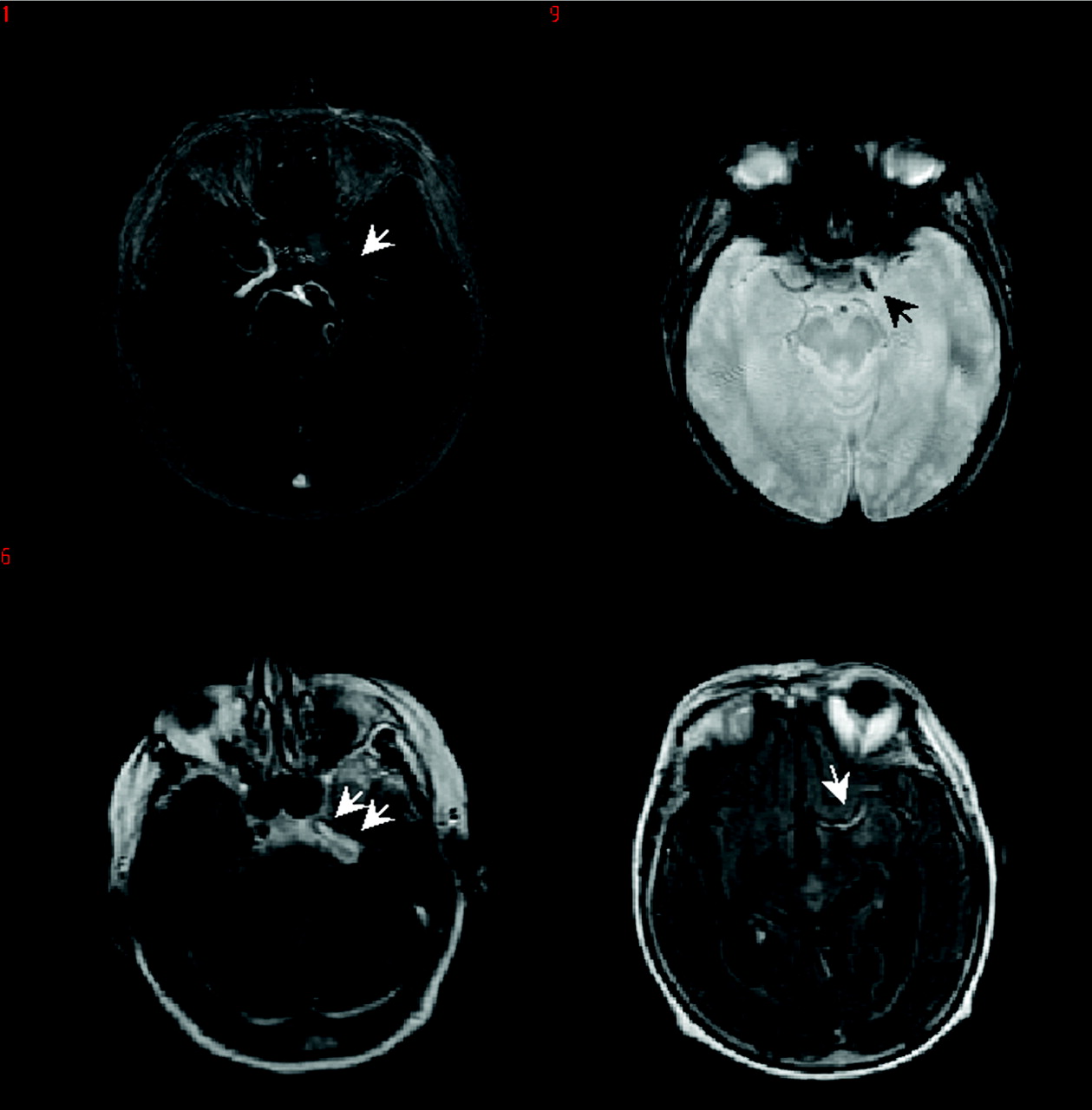 An 82-year-old female patient with cardioembolic stroke, baseline NIHSSS of 18 received rt-PA 88 minutes after symptom onset. Stroke MR imaging at 40 minutes after symptom onset. MRA (upper left) shows left-sided ICA occlusion extending into the MCA (arrows). This occlusion is seen on GRE (upper right, arrows) as a GRE SVS only at the level of the MCA, a FLAIR HVS can be seen at the level of the ICA and MCA (lower row, arrows).