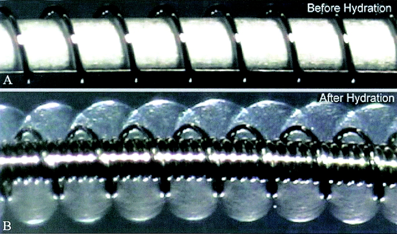 HydroCoils are a new hybrid embolic device that is part of the growing line of embolic agents chemically pretreated to enhance their intended function. In this particular instance, carrier platinum coils are coupled to an expandable hydrogel material that results in delayed progressive expansion of the coil once it comes in contact with a water-based substance, such as blood, with a pH of 7.4. The expansion is expected to begin 5 minutes after exposure and completed by 20 minutes. By expanding as much as nine times its prehydrated volume, these coils achieve a more complete volumetric occlusion of aneurysms (8). The ability of this coil to more completely fill the aneurysm contrasts with preexisting platinum coils, where complete angiographic occlusion might represent only 20–30% occlusion of the aneurysmal sac with platinum coils, the rest of the volume occupied by thrombus. An additional apparent advantage of HydroCoils is that they may cause advanced healing and endothelialization at the aneurysm neck (5,8). The first clinical experience demonstrating technical feasibility and increased volumetric aneurysm filling with HydroCoils relative to pure platinum coils in 11 patients was recently published (6).