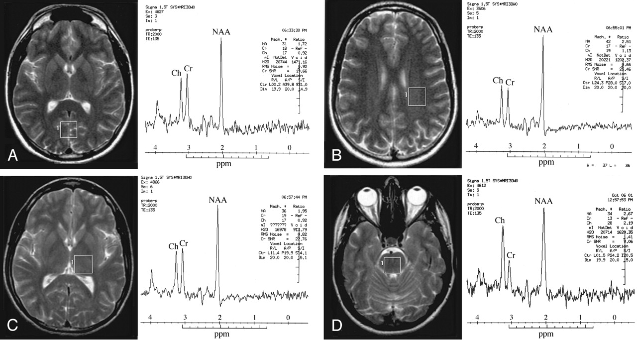 Single voxel PRESS proton MR spectra (TR/TE = 2000/135) demonstrate choline (Ch), creatine (Cr), and N-acetylaspartate (NAA) peaks from occipital gray matter (A), posterior white matter (B), thalamus (C), and pons (D). The axial T2 FSE image shows the voxel location for the acquired spectrum. The chemical shift scale is in parts per million relative to tetramethylsilane.