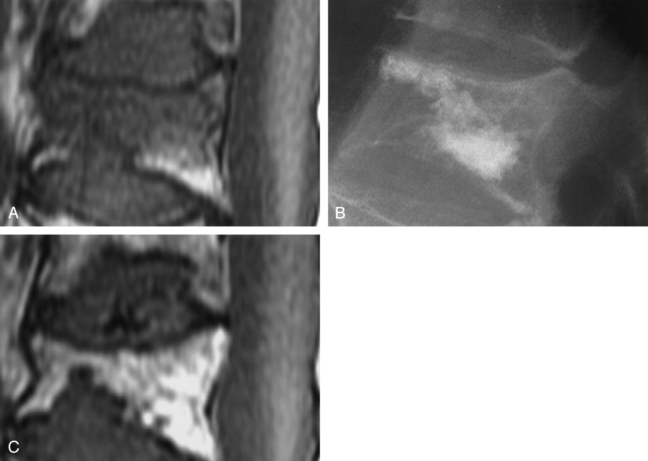 To date, we know of only two published studies (12, 13) in which MRI findings after VP are discussed. Both studies describe the appearance of the cement, but neither describes the appearance of the surrounding bone. Also, neither study attempts to demonstrate that the previously treated vertebra was not an ongoing source of pain. In our study, we described MRI findings in patients who returned after VP with back pain, but whose back pain was attributable to a source other than the previously treated vertebra. As a result, our findings are particularly applicable for the increasing number of patients those who return for spinal MRI after VP with recurrent or residual pain of uncertain origin.