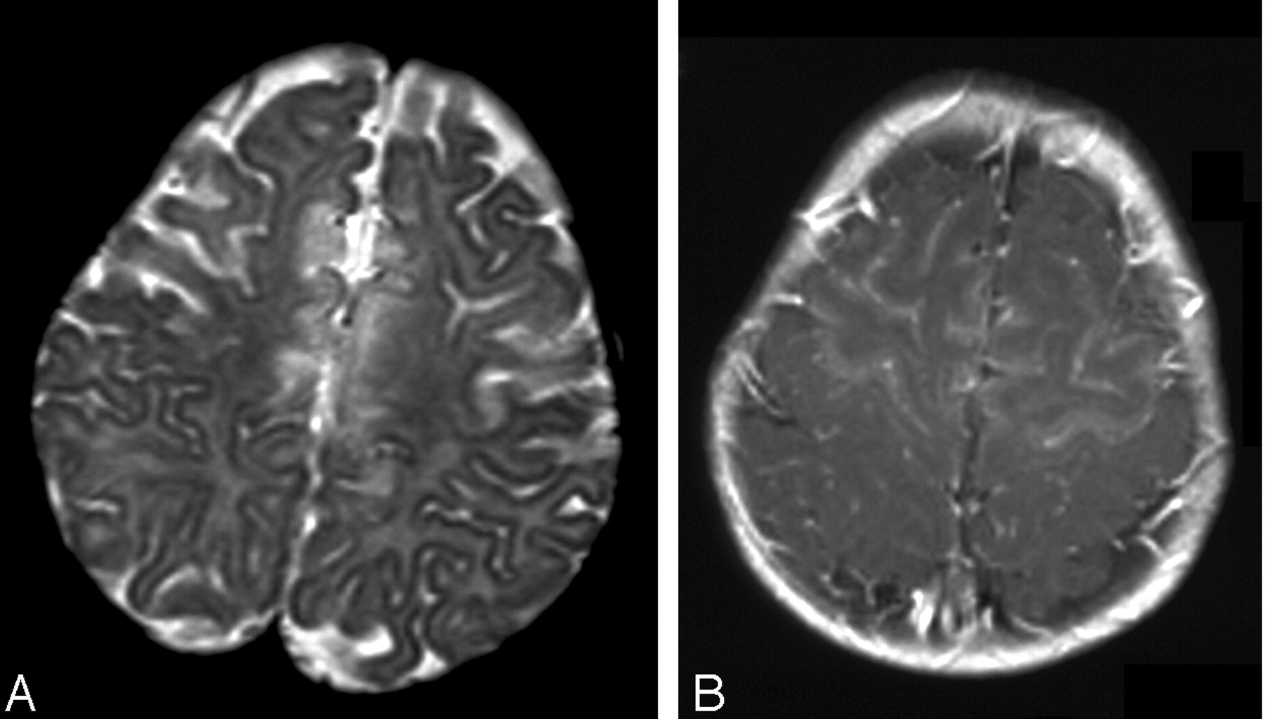 On MR examination at presentation, T2-weighted images showed hyperintensity of the mammillary bodies, periaqueductal gray matter, thalami, and basal ganglia in four patients, and images showed hyperintensity of the brainstem in three (Figs 1A and 2A). In one infant, involvement of the deep gray matter structures was visualized on follow-up study performed 5 days later because of clinical deterioration (Fig 1B–D). All patients had abnormal hyperintensity in the frontal regions. Four had diffuse involvement of both cortex and white matter up to the central gyrus (Figs 2B and 3). All lesions were bilateral and symmetric. In one infant, only the superior frontal region was involved, and in our youngest patient, only the precentral region (Fig 4A). Of note, optimal visualization of the mammillary bodies was not achieved in this patient.