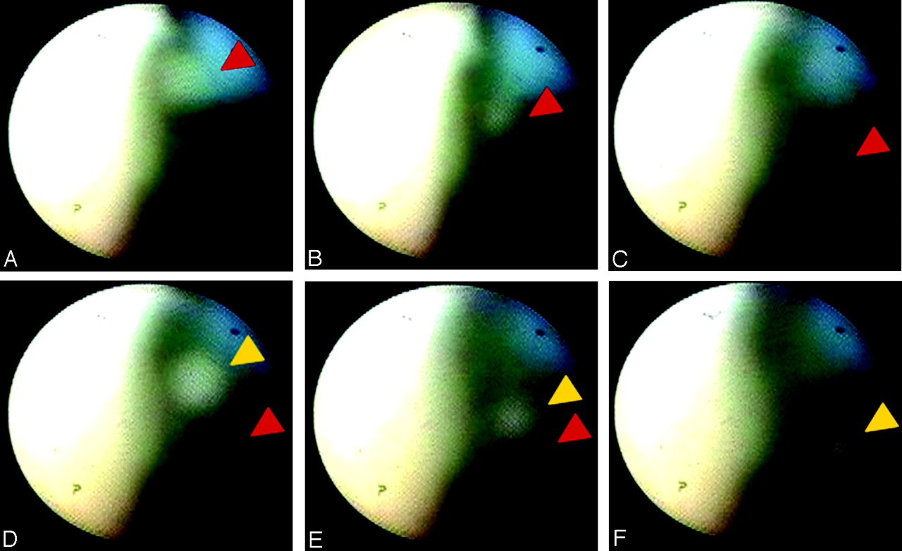 Case A was a 73-year-old man. During carotid angioplasty with stent placement with the distal protection by PercuSurge GuardWire, debris was cleared by aspiration of 50 mL of blood and flushing with 50 mL of saline. Even after this aspiration and drainage of debris, some debris was still floating and several other small bits of debris came out of the crushed atherosclerotic wall. The floating debris and its detachment from the plaque could be observed by angioscopy (Fig 3A–F). Aspiration and irrigation of the debris were repeated. Anticoagulation with heparin (10,000 IU/day) was given for 2 additional days after carotid angioplasty with stent placement. In this case, diffusion-weighted MR imaging could not be performed 1 day after carotid angioplasty with stent placement because of mechanical problems. There were no ischemic lesions seen in the T1- and T2-weighted MR images 4 weeks after the procedure. There was no noticeable neurologic change, and the patient remained as before.