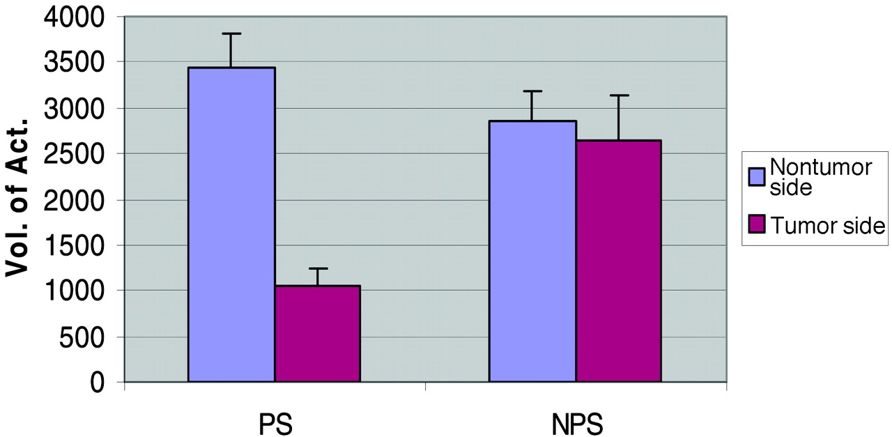Average volume of activation measurements in prior-surgery (PS) and no-prior-surgery (NPS) groups. There is a marked decrease in the tumor side activation volumes of patients with prior surgery.