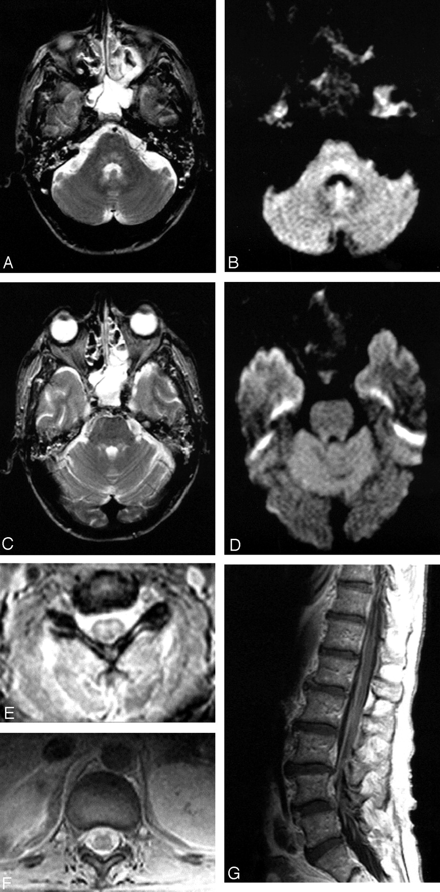 Patient 2, a 40-year-old man admitted with encephalitis and developed flaccid paralysis during hospitalization: axial FSE T2-weighted (A) and trace DW (B) images demonstrate increased signal intensity in the pontine tegmentum. Increased signal intensity was also seen in the superior cerebellar peduncles on FSE T2-weighted image (C), but not on the trace DW image (D). The patient was intubated at the time of imaging, which resulted in opacified sinuses and mastoid air cells. Axial GRE sequences through the cervical (E) and thoracic cord (F) show abnormal signal intensity in the gray matter with more pronounced involvement of the ventral horns. Postcontrast sagittal T1-weighted image (G) demonstrates enhancement of the cauda equina.