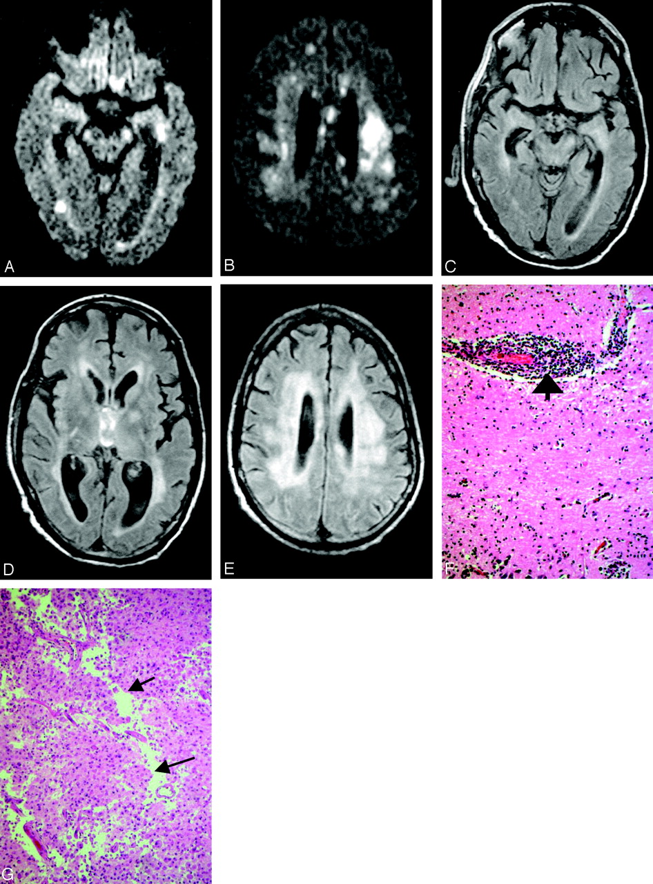 Patient 11, a 51-year-old man post renal and pancreatic transplant with recent mosquito exposure. Axial DW images show patchy areas of increased signal intensity in the periventricular white matter and left cerebral peduncle (A) as well as corona radiata and corpus callosum (B). Axial FLAIR sequences demonstrate subtle abnormalities in the left mesial temporal lobe, both cerebral peduncles, more pronounced in the left one (C), and both thalami and left globus pallidus (D). Diffusely increased signal intensity is also present in the deep hemispheric white matter (D and E). Histopathology (F) shows the hippocampus with marked perivascular (bold arrow) lymphocytic inflammation (hematoxylin and eosin; original magnification 200×). Histopathology (G) demonstrates white matter infarct with necrosis, macrophage and early cavitary changes (cavitation delineated by arrows) (hematoxylin and eosin; original magnification 200×).