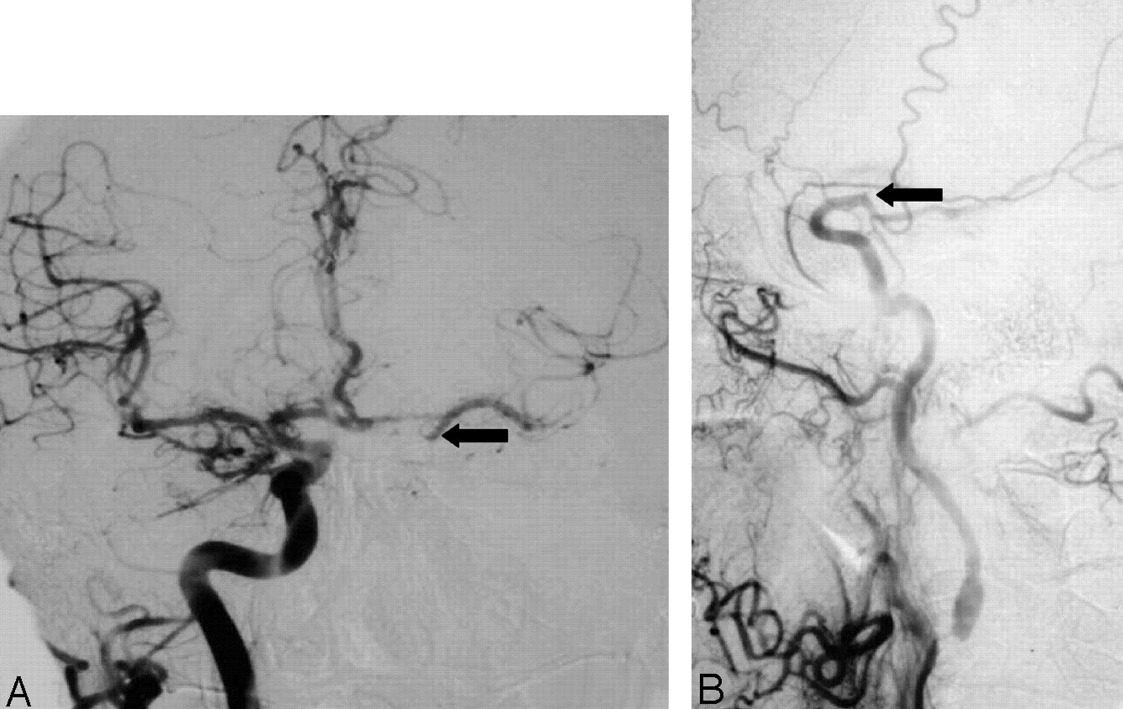 B, There is dilution of contrast of middle cerebral branches (small arrows) intracranially, implying inflow of unopacified blood from circle of Willis collateral sources.