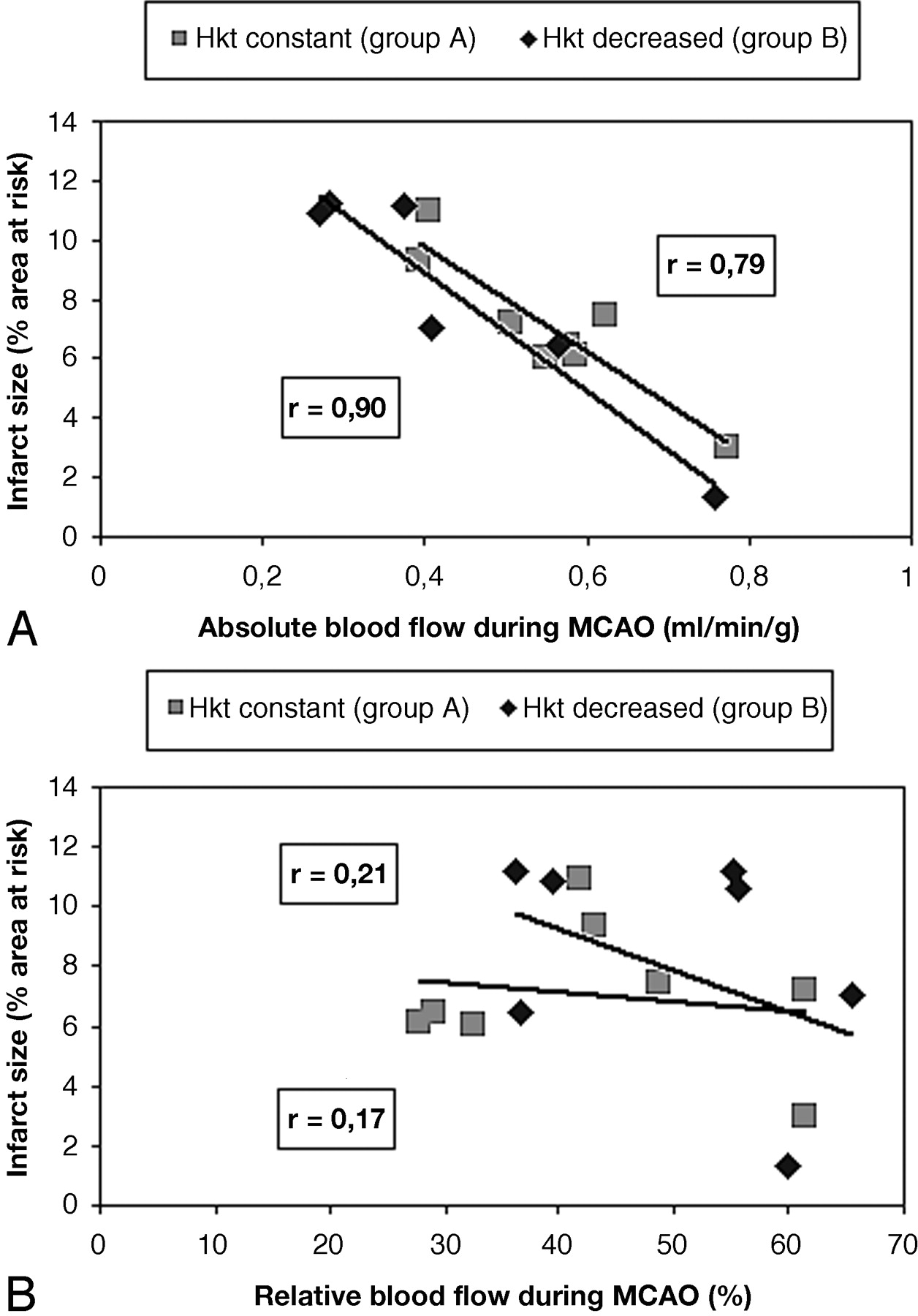 Relationships between absolute CBF and relative CBFC at 30 minutes post-MCAO and infarct size in groups A (A) and B (B) (expressed as percentage of total brain size). Hkt indicates hematocrit.