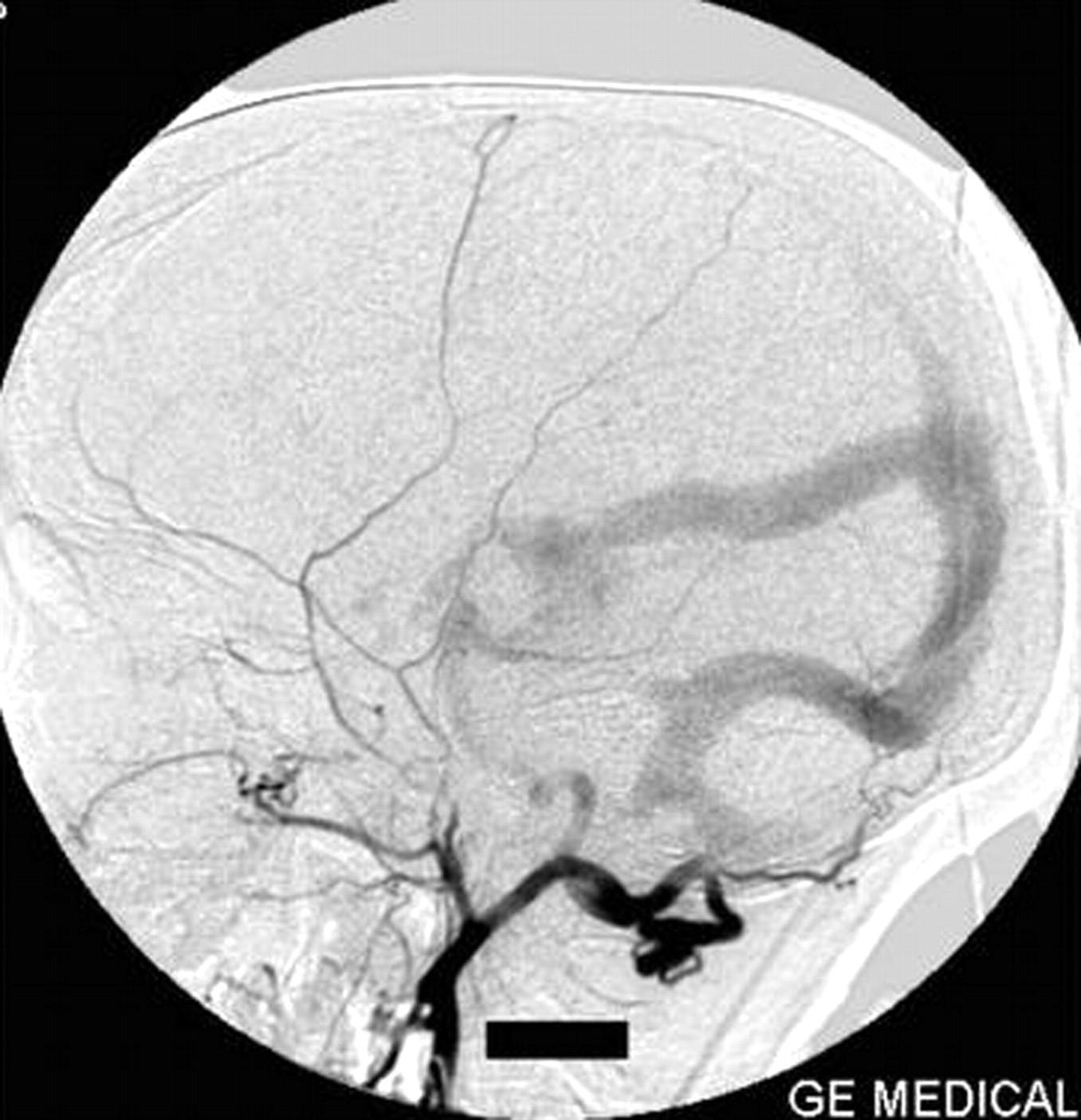 A 6-year-old girl of nonconsanguineous parents presented with a history of gradual proptosis of both eyes and prominence of the forehead since 4 years of age. On examination, she had no neurologic deficit and all biochemical parameters were within normal limits. CT of the head showed mild ventriculomegaly and prominent enhancing vessels in the perimesencephalic region and in the cistern of the velum interpositum. A dilated enhancing venous sac was also noted below the splenium of the corpus callosum, which continued posteriorly and joined a prominent superior sagittal sinus. Enhancing enlarged vessels were also seen in the cortical surface. The cavernous sinuses were enlarged bilaterally. Both superior and inferior ophthalmic veins were enlarged and tortuous. No parenchymal lesion was seen.
