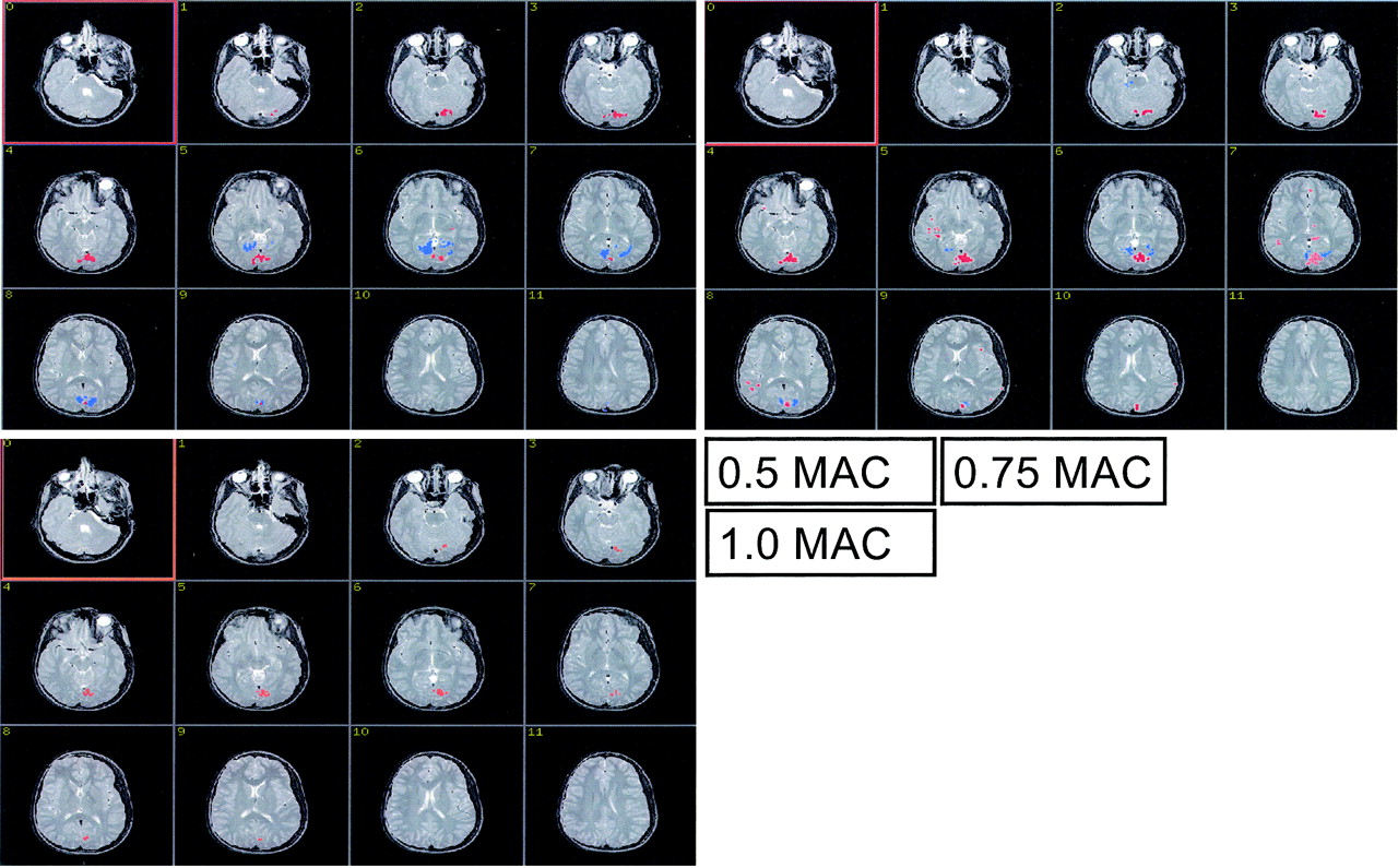 At a concentration of 0.5 MAC, sevoflurane diminishes the extent of activation, but the BOLD signal intensity amplitude is comparable with that of a waking subject.11 At a concentration of 0.75 MAC sevoflurane, the BOLD signal intensity amplitude is significantly lower than that of a waking subject but the extent of activation increases compared with a concentration of 0.5 MAC. At a concentration of 1.0 MAC, both BOLD signal intensity amplitude and extent of activation decline.