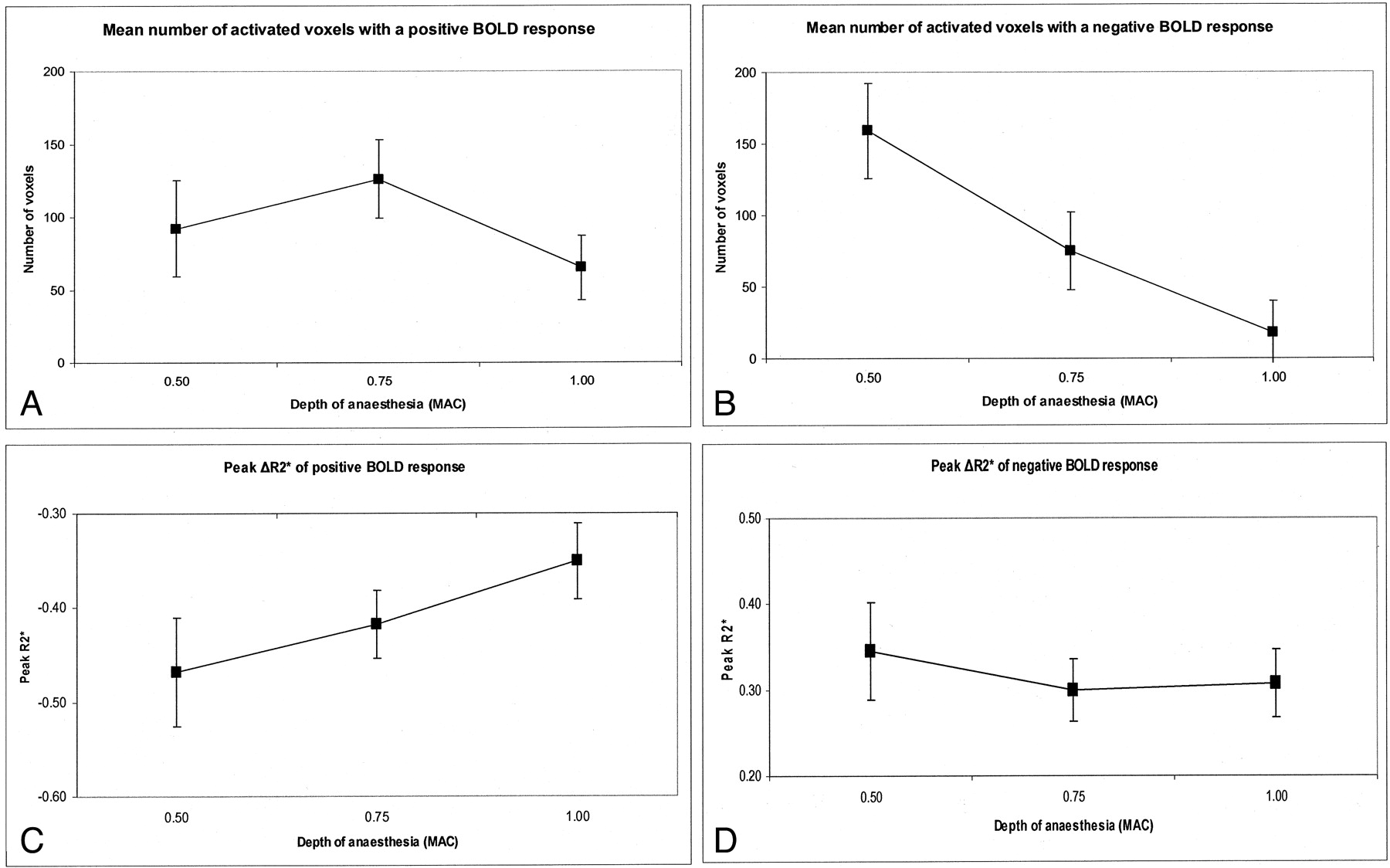 A, The mean number of activated voxels with a positive BOLD response. B, The mean number of activated voxels with a negative BOLD response at the 3 levels of sevoflurane anesthesia. C, The mean, peak ΔR2* from the positive BOLD. D, The mean, peak ΔR2* from the negative BOLD response at the 3 levels of sevoflurane anesthesia. The error bars indicate the standard error of the mean.