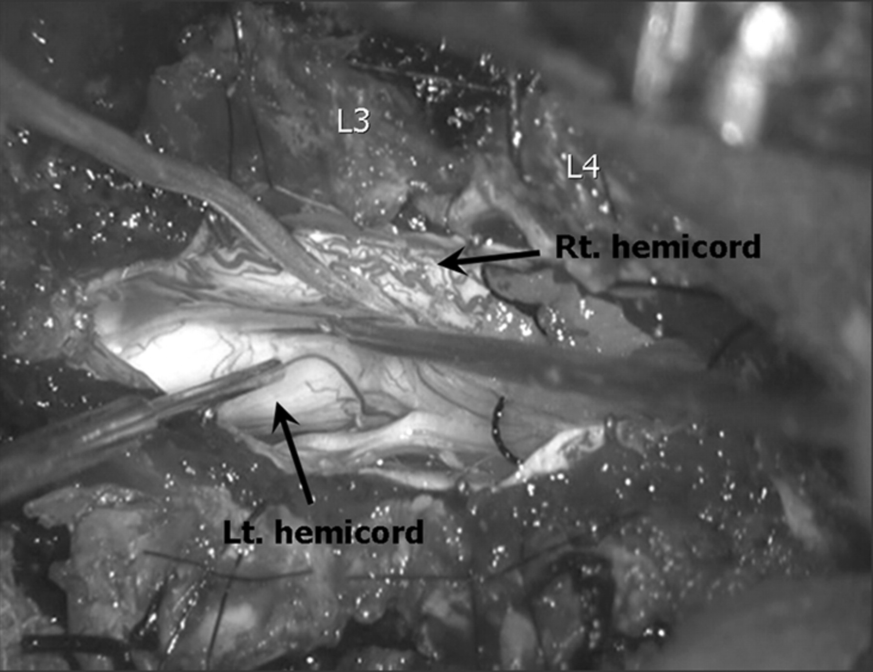 Photograph of the intraoperative surgical field shows an asymmetric duplication of the spinal cord, which is encompassed by the single dural sac.
