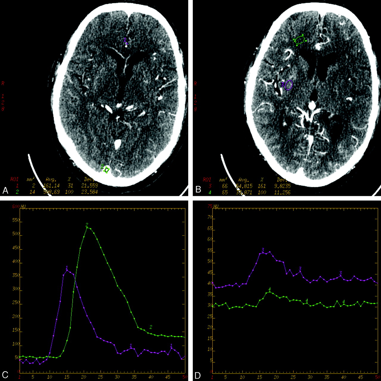 The regions of interest (ROI) for an arterial input (ACA) and venous output (sagittal sinus) (A) and for gray matter and white matter (B). The corresponding time-concentration curves are presented in C, in which curve 1 indicates the artery and curve, 2 the vein, and in D, in which curve 3 indicates gray matter and curve 4, white matter.