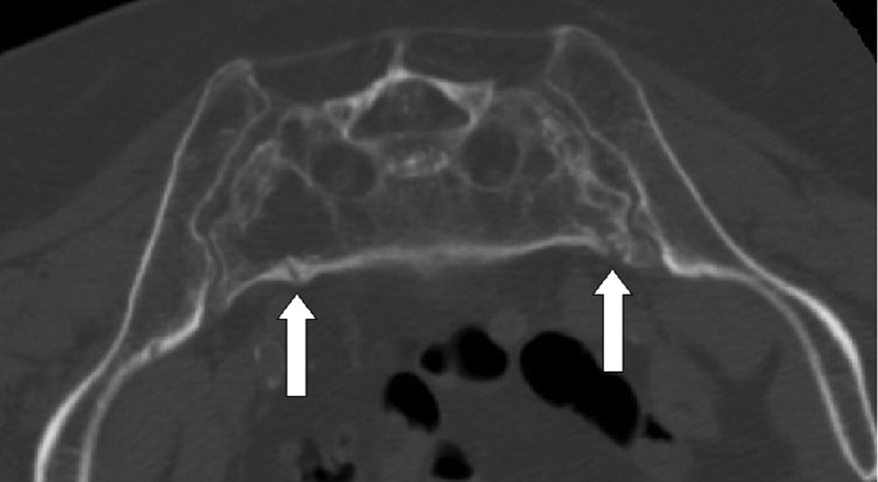 Stress fractures of the sacrum may represent commonly overlooked causes of low back pain. Such injuries primarily occur in elderly women with osteoporosis as a result of normal stress on abnormally weak bone. First described by Lourie in 1982 as a “spontaneous fracture of the sacrum,”1 this injury is known as a sacral insufficiency fracture (SIF). Although most occur in zone 1 of the sacrum,2 thus involving the sacral alae without damaging the neural elements in the central canal or foramina, pain can be severe and may significantly limit the patient’s mobilization.3 Given that the prevalence in female patients older than 55 years in the United States is estimated to be approximately 2%,4 treatment options for such patients must be explored.