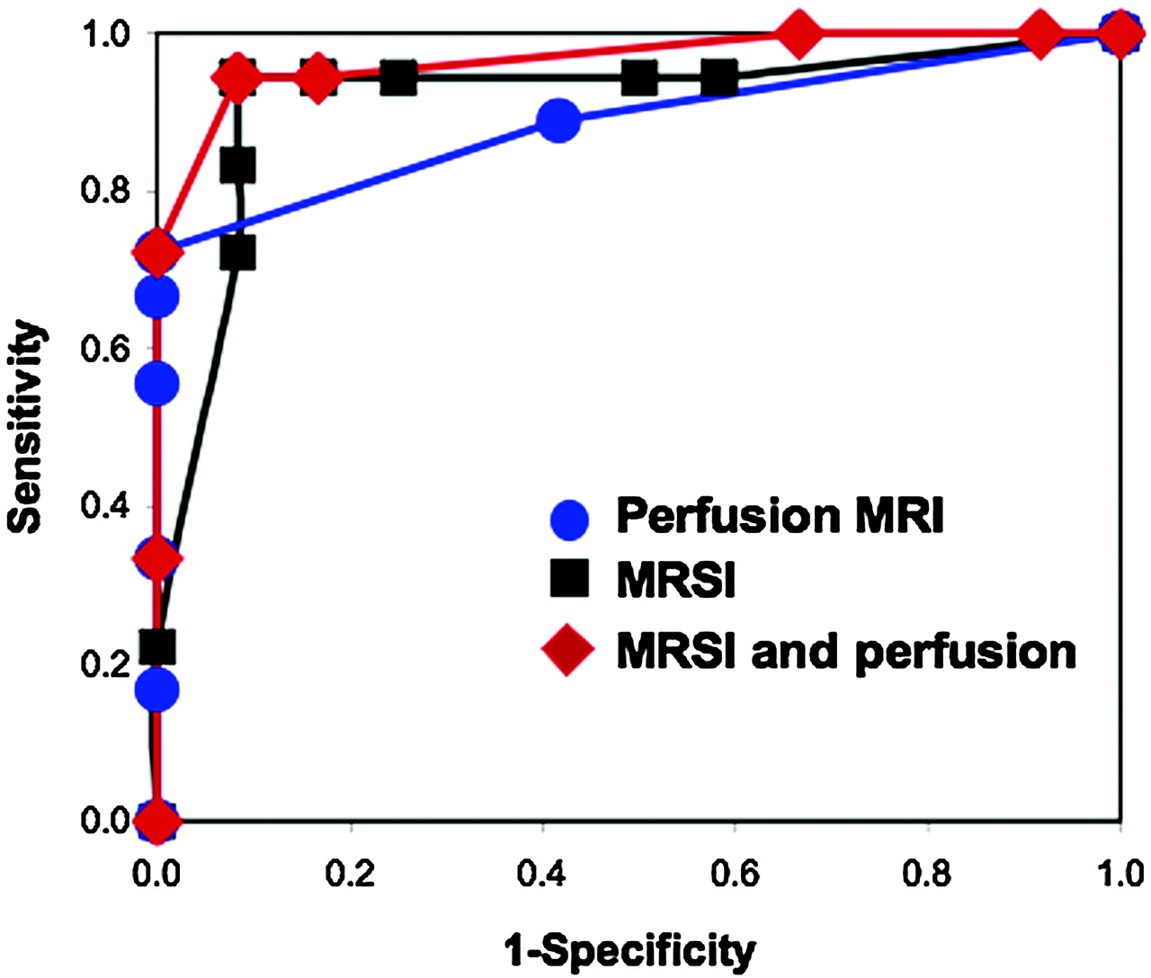 ROC curves representing discriminatory capability of perfusion MR imaging, 1H-MRSI and combination of 1H-MRSI and perfusion MR imaging to differentiate between tumors and nonneoplastic lesions. We constructed the curves using data on 30 subjects evaluated with both perfusion MR imaging and MRSI. The calculated areas under the ROC curves were 0.92 for MRSI, 0.89 for perfusion MR imaging, and 0.96 for the analysis on the basis of MRSI and perfusion MR imaging. We found no significant differences when comparing the areas under the curves, indicating that each procedure had similar discriminatory capability for these subjects.