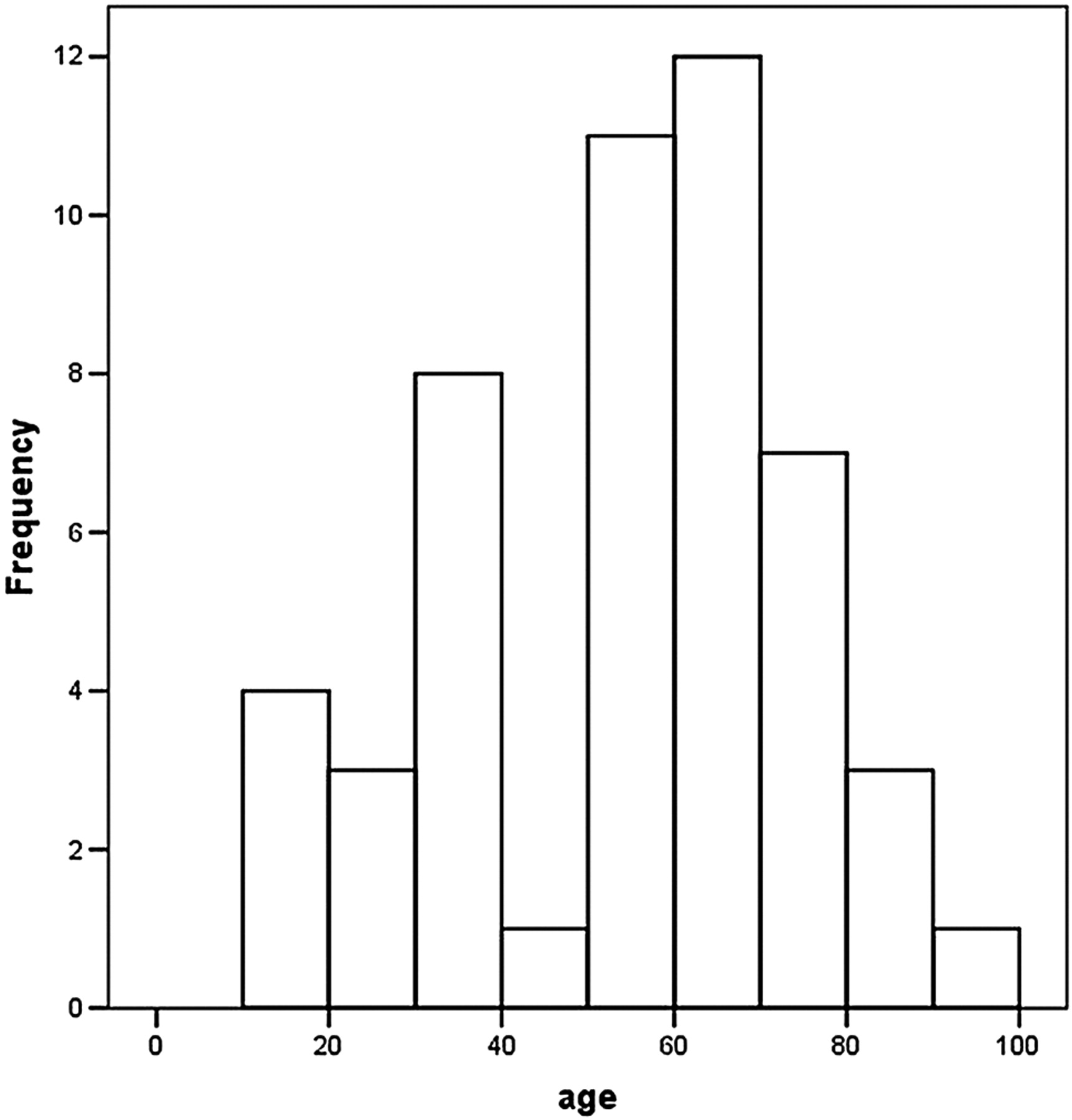 The mean age of the patients was 54 ± 20 years (mean ± SD) ranging from 12 to 91 years (30 male and 20 female). Age distribution for the entire collective was found as illustrated in Fig 2.